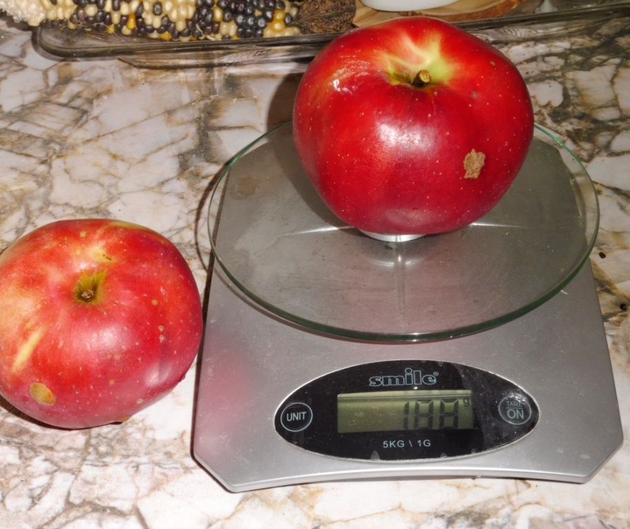Яблоки весом 160-188г, красные, мякоть с красным оттенком.Вкус сладкий, кислинка потом проявляется, сорт старый - отец соседа сажал. Если сравнивать с Арбатом, то Арбат лучше (у него вес 208г, и вкус замечательный - кисло-сладкий)