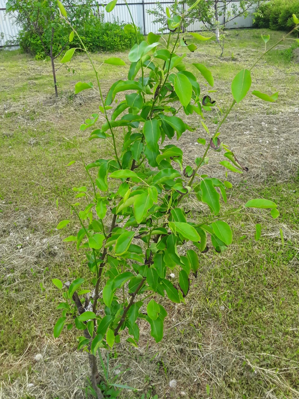 Подскажите, пожалуйста, что с грушей: посажена 2-летка год назад, выглядела здоровой, подросла. Три недели назад начали чернеть и усыхать листья от кромки к середине, затем скручиваются наверх. Вредителей не видно. Было сухо, пролили ее, подкормили калием. Лучше не стало. Что это за напасть? Спасибо заранее!