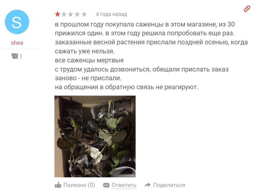 Отдельно впечатлил отзыв про покупку 30 саженцев, из которых 1 только выжил. А что удивило ещё больше - это желание человека повторить заказ (внимание!) там же! Нетрудно посчитать, что за одно выжившее растение человек заплатил 10-12 тысяч рублей и, видимо, показалось, что недостаточно дорого - повторил!