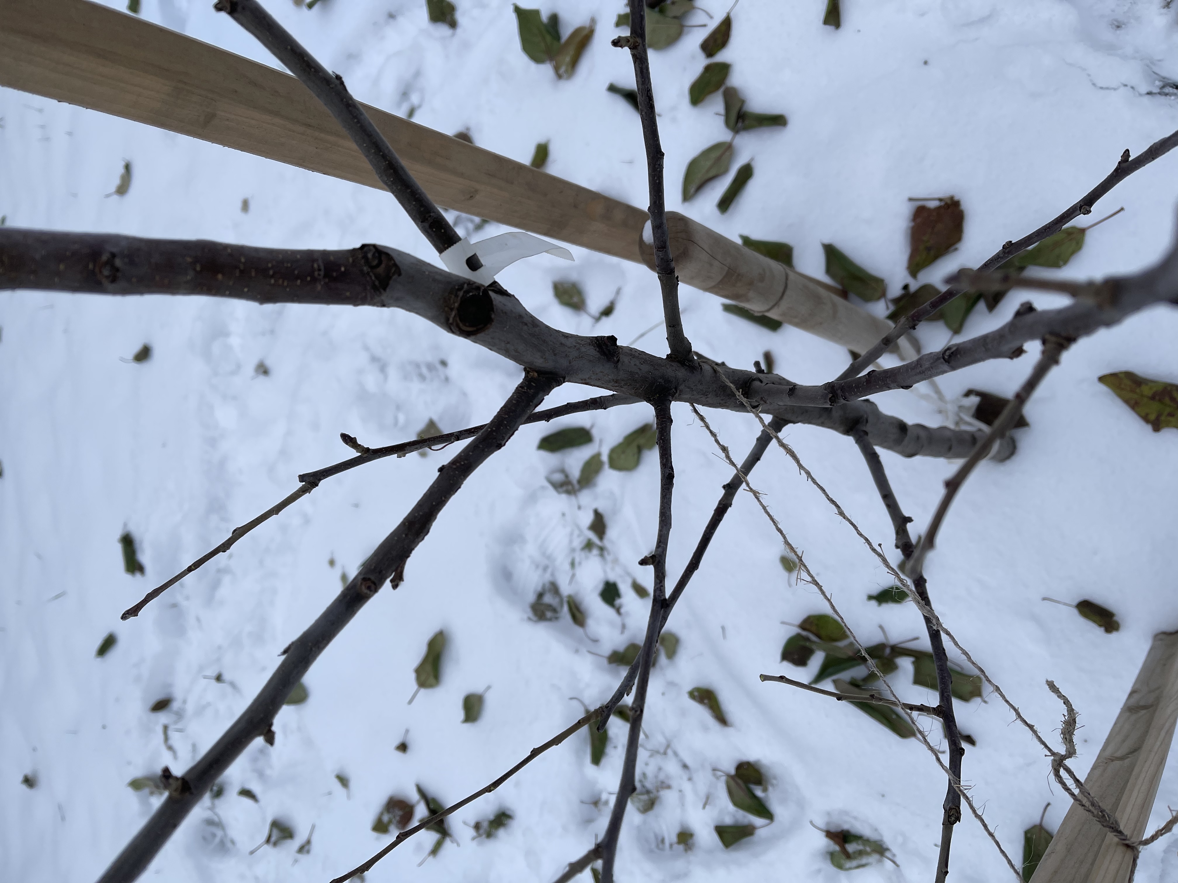 Получается две верхние ветки не трогать и не обрезать верхушки? А по двум нижним веткам - за верхнюю часть побега привязать верёвку и тянуть к стволу? Про кол не поняла, который стоит - был установлен при посадке, не шатается или надо вбить ещё один кол?