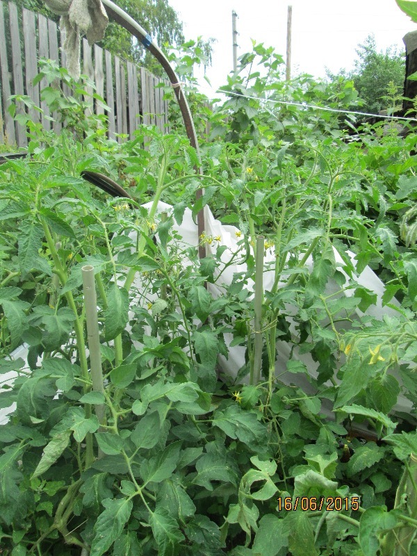 А что у томатов с посадкой может быть не так?? Обычный суглинок, обычные мин. и оргудобрения, обычная-стандартная посадка "лёжа", тут же вся поверхность почвы мульчирована (с досыпанием в междурядья) и подвязано посажение к колу (сейчас бы иначе сделал, "голова" куста между 2-мя шпагатами на ряду кольев, хотя не знаю как бы это держалось, нужно натяжение).