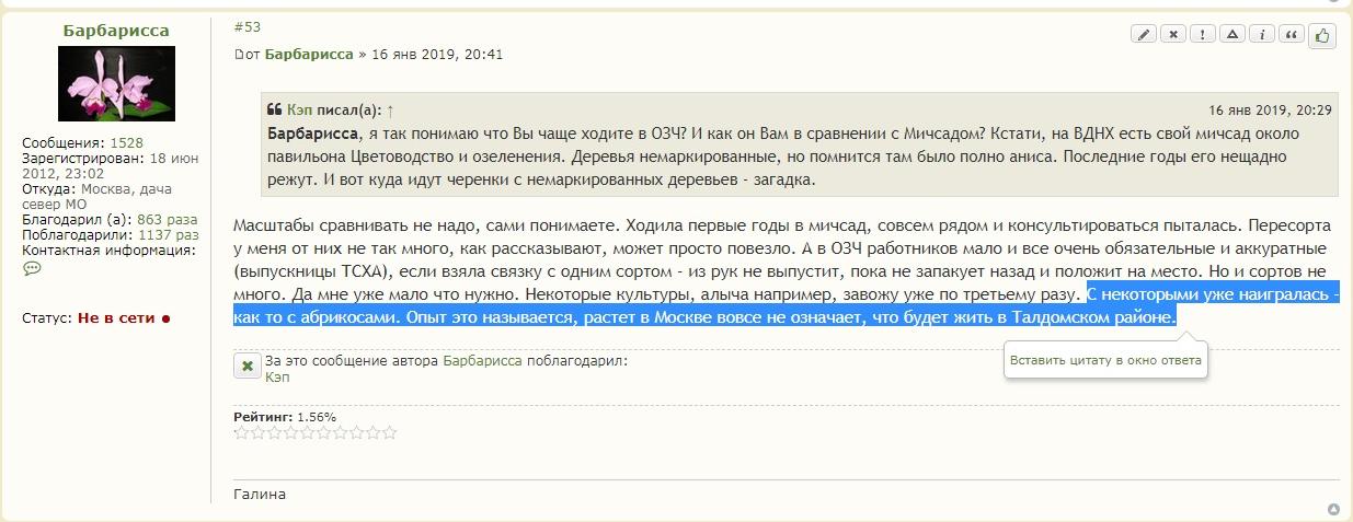 1. Выделяем мышью заинтересовавший фрагмент текста. Автоматически всплывает надпись Вставить цитату в окно ответа. Воспользуйтесь предложением - нажмите на на данную надпись мышью. 2. Выделенная часть сообщения скопировалась в виде цитаты в окно для ввода текста. Выделяем всю информацию в окне и жмем правую клавишу мыши. В открывшемся контестном меню выберите пункт Вырезать 3. Выбираем нужную тему, в данном случае это "Абрикос Ч.2" - http://forum.prihoz.ru/viewtopic.php?f=37&t=7076, в теме переходим в окно ввода текста, в окне жмем правую клавишу мыши,выбираем команду Вставить. Убедились что текст вставился и жмем кнопку Отправить Ваше сообщение отправлено. Человеку, которого вы процитировали придет уведомление о цитировании и он обязательно зайдет в тему и ответит на вопросы. А модератору не нужно будет ничего удалять/переносить.