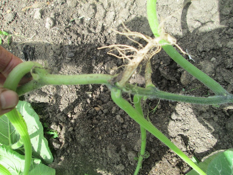 1. У одного моего знакомого с коровой и унавоженными поэтому площадями одно растение тыквы, выросшее из подаренной мной рассады, дало однажды 33 плода по 15 кг в среднем. Это произошло не только за счёт плодородной земли, а, в основном, потому, что доппитание плети получали от таких вот дополнительных корней.
