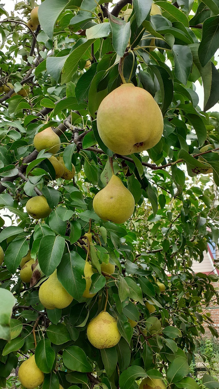 Благо соседка была в это время в огороде и успела быстро прибежать. В итоге 7л. ведро мне, 7л. ведро ей и 10л. ведро измочаленных груш в компост. Это с четырехлетки. Себе точно сажать не буду, потому как в связи с тем, что хранить такую прорву груш негде, делить урожай с соседкой регулярно будем пополам. Уход за деревьями мой, земля соседки - все честно.