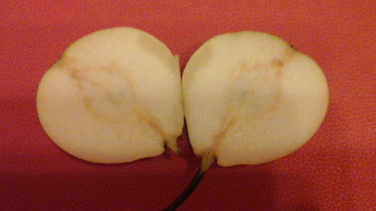 Продолжу про Мраморную. Позавчера чуть пошевелил одну из груш на ветке и она оказалась на ладони. На ощупь довольно твердая, но плодоножки отрываются без усилия. Сегодня провел вскрытие. Мякоть еще немного мучнистая, но сочная. Семечки только начинают темнеть. Сахаров маловато, но вполне съедобна. Думаю еще минимум недельку груши должны повисеть.