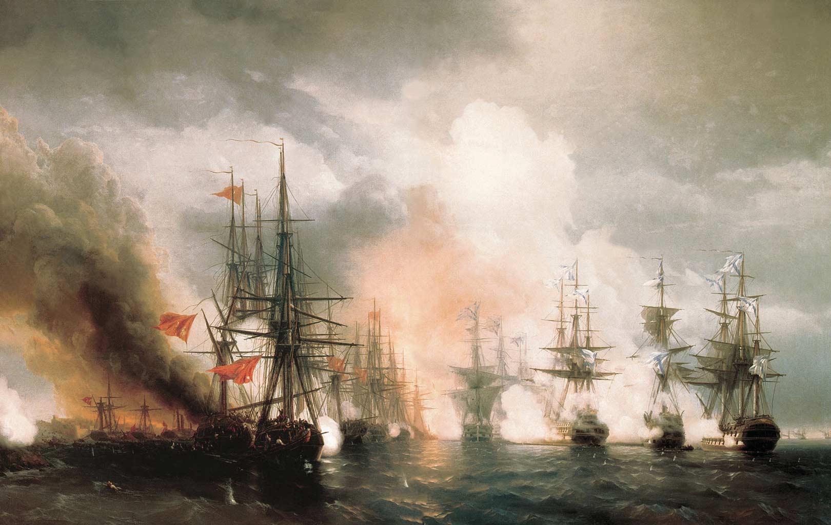 Около 12 часов 30 минут, когда русские корабли подошли к назначенным местам, турецкая эскадра и береговые батареи открыли сильный огонь. В первые минуты русские корабли были буквально засыпаны градом ядер, книпелей и картечи.