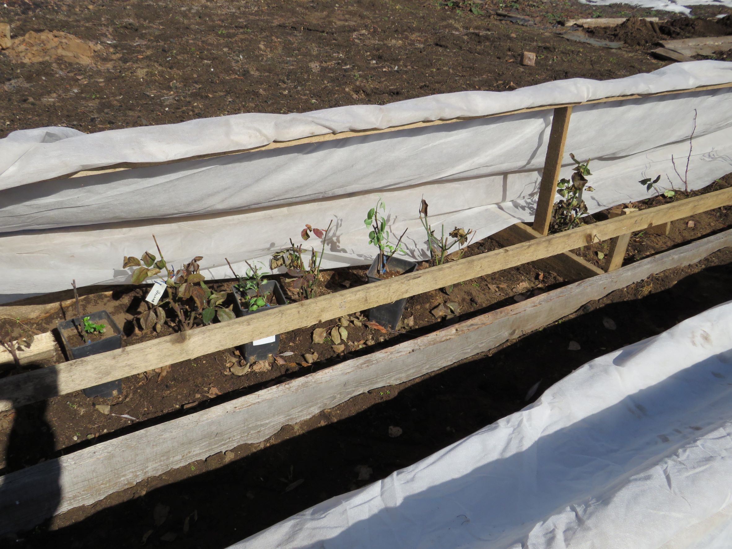 У соседа стоял куст вьющейся розы, закутанный как всегда покрывным материалом - тоже почернел, ждет, что от корней пойдет.