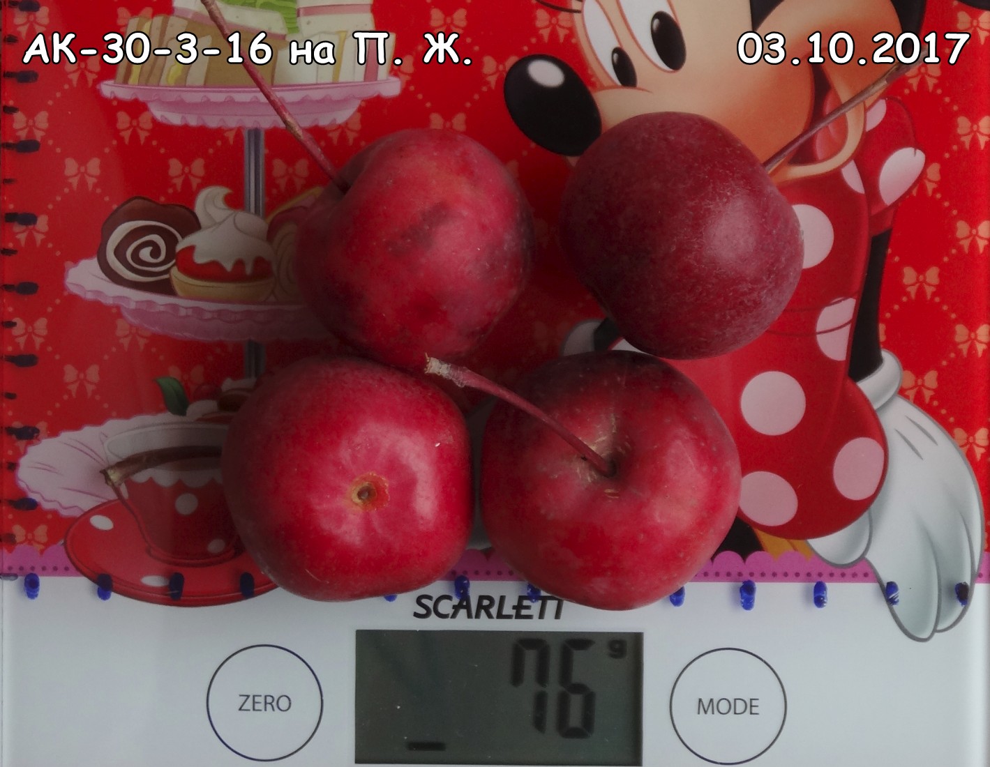 АК-30-3-16, прививка 2016 года в крону Памяти Жаворонкова, первое плодоношение, 9 штук. Вкус кисло-сладкий, во рту вяжущее послевкусие. Некоторые ранетки переспелые, но держались крепко.