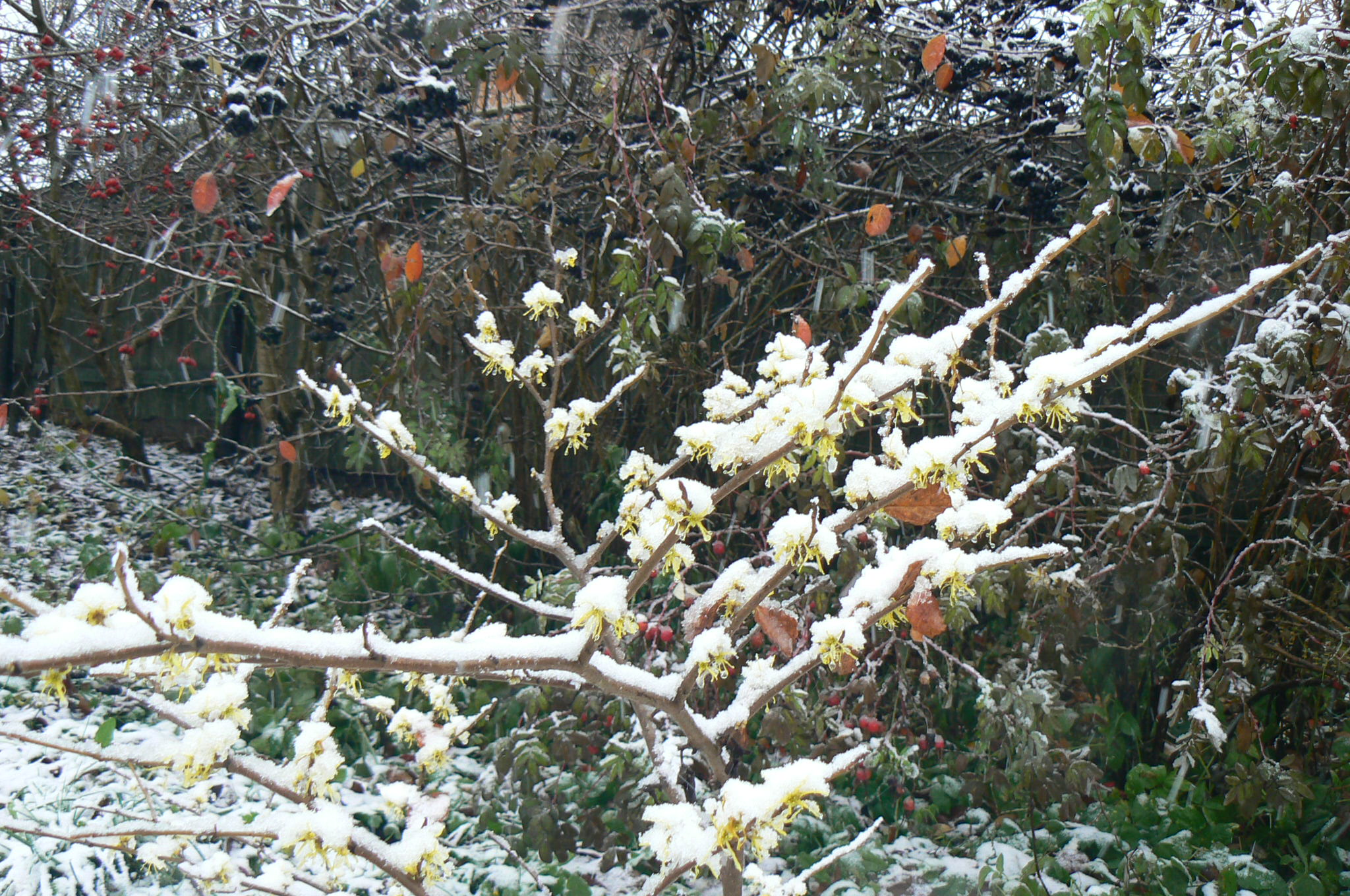 Стряхнул снег , и только сейчас обратил внимание , что он нынче и цвет не полностью набралМожно сказать что розовым остался , а обычно под снег уходит темно-красным