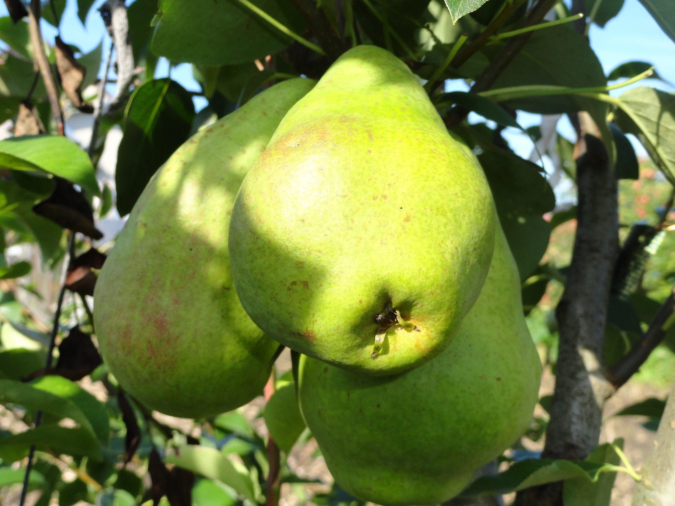 Первое плодоношение,высота не более 3,5 метров навскидку.Нижний ярус отходит под тупыми углами,как результат гирлянды плодов.По форме похожи на Любимицу Яковлева,массой от 50 до 100 с небольшим грамм.Пока не созрели,твёрдые,терпкие,кислосладкие со слабым грушевым ароматом.Сорвал несколько штук,положу дозариваться на семена.Дорога к ней протоптана...Разве что падалица достанется.