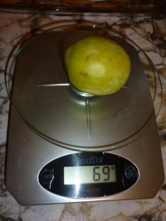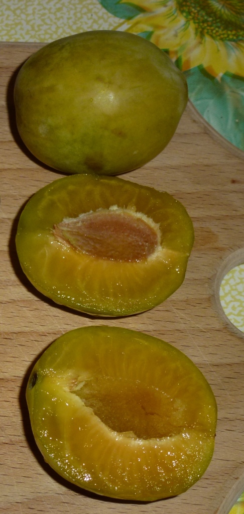 Косточка очень большая, ближе к круглой, напоминает абрикосовую, от мякоти не отделяется. Мякоть сочная, достаточно сладкая, кожица толстая с кислотой.