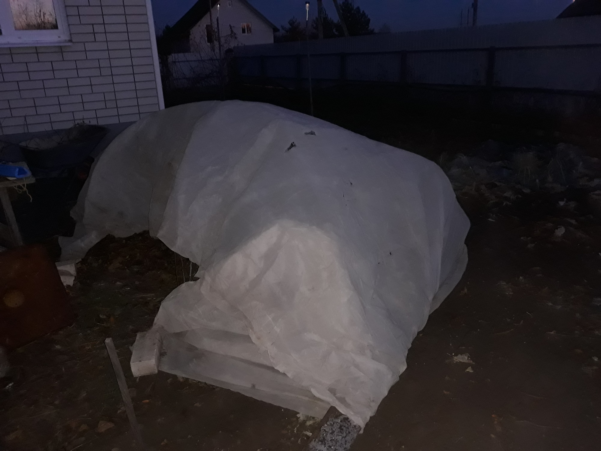 Обмотала его покрывным материалом (весь зеленый в листве), а у нас +5 градС и холодные проливные дожди.