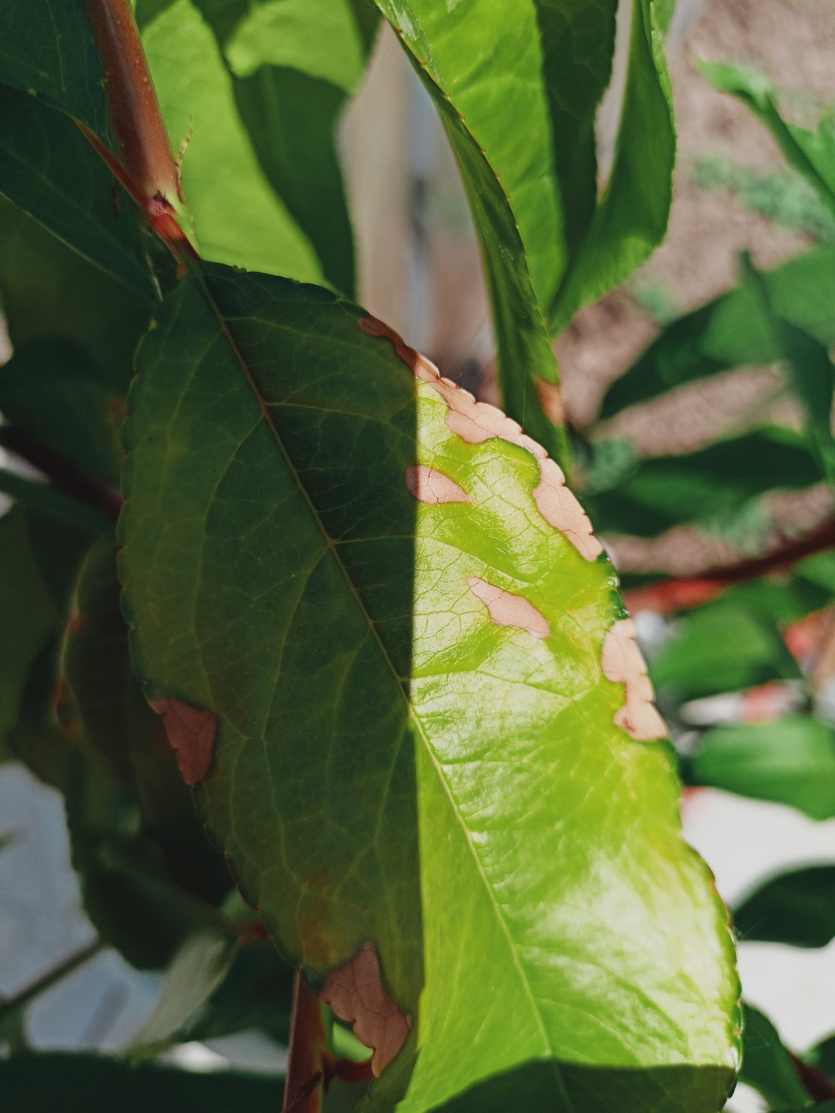 Подскажите, пожалуйста, почему у персика в контейнере листья становятся желто-оливкового цвета и небольшие пятна некроза? Поливаю регулярно, 2 раза подкармливала и обрабатывала от болезней. Может это быть хим.ожогом? Привито несколько сортов на сеянец персика