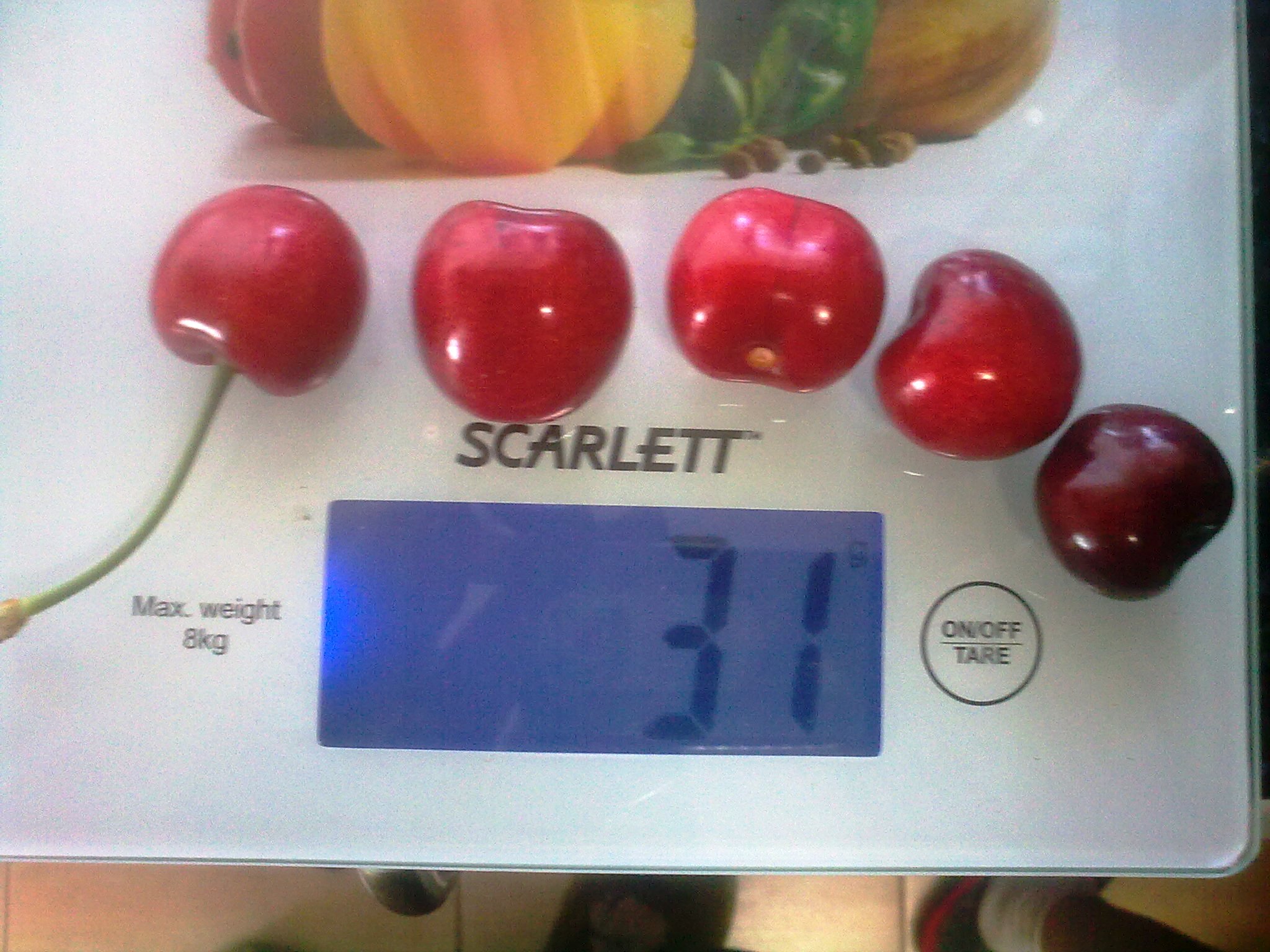 Что касается вкуса - показания Интернета разнятся, Есичев, например, дает 4,7: "Получен во Всероссийском НИИ люпина. Плоды позднего срока созревания, темно-красные, почти черные, во влажные годы не растрескиваются. Дерево сдержанного роста, крона густая, раскидистая. Зимостойкость дерева и цветковых почек хорошая. Мякоть и сок окрашенные, отрыв сухой. Плоды плотные, средняя масса 5,1 г, максимальная 7,5 г. Дегустационная оценка плодов 4,7 балла. Лучшие опылители: Овстуженка, Тютчевка, Брянская розовая, Бряночка."