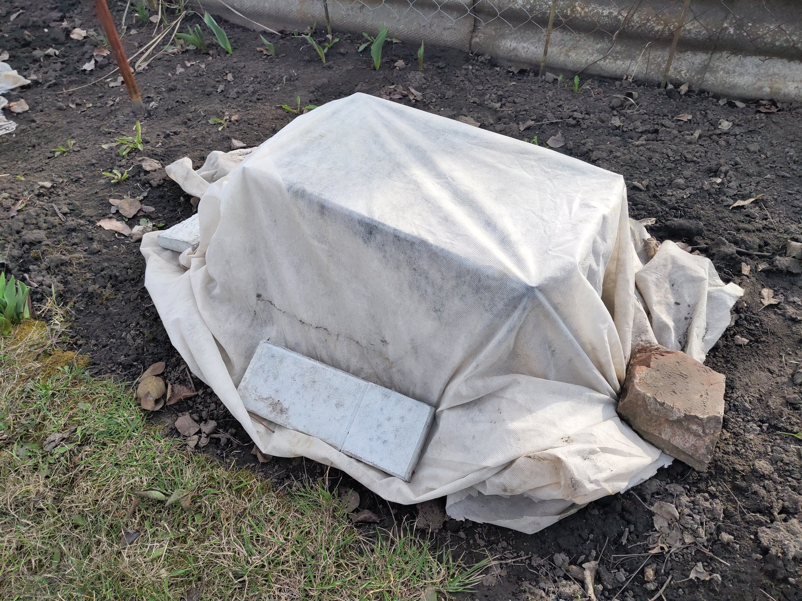 Укрывал примитивно - пластиковый ящик из-под фруктов, а сверху укрывной. Пленку не использовал. Лишнее подтверждение тому, что ежевика не виноград и выпревания не боится. Кусты проветрил, обработал ХОМом и укрыл обратно.