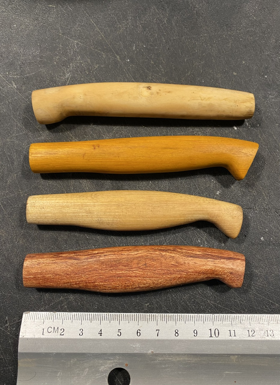 Вес имеет значение, предпочитаю дерево для рукоятки, легче и приятно в руке держать. На фото сверху-вниз : слива, граб, берёза, розовое дерево.