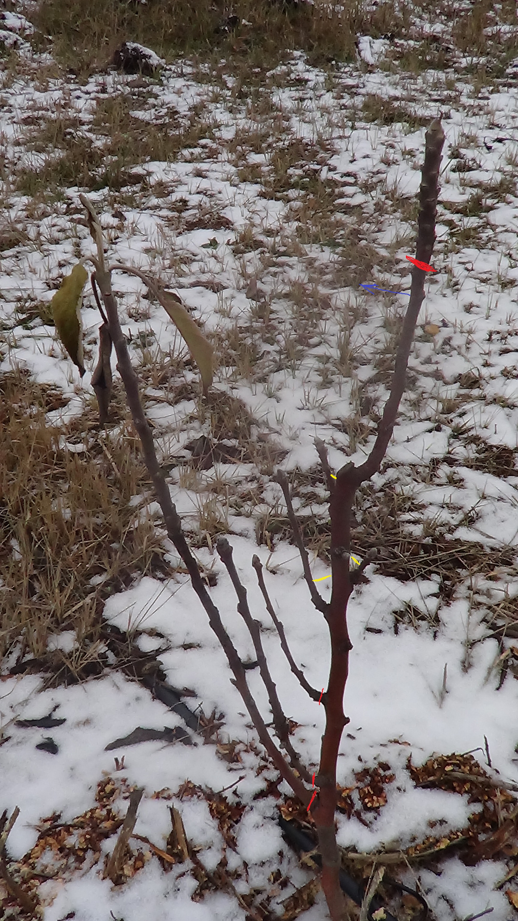 Красным помечены места предполагаемой обрезки, желтым- установка "зубочисток", синим- изменение положения веток/саженца.