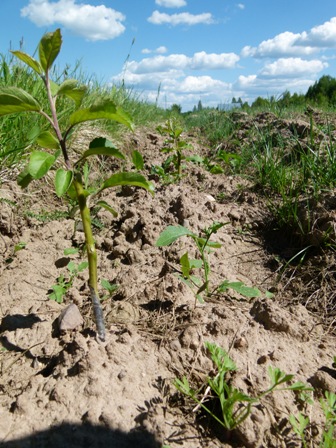 Немного об успехах: да год у нас задался "урожайный"! Груш мало, слив и вишни по всей Твери нет...Садовая земляника еще спеет (1 июля!!!), жимолость только-только отошла. Пожалуй, только ранние яблоки будут, но везде слизни-слизни, эпитофия! Между тем, несмотря на такую весну и холодное лето (или даже благодаря, потому что мы капельную систему вот-вот монтируем) яблоньки с зимней прививки взошли и принялись без полива, маточник подвоев 54-118 вообще без выпадов (на данный момент). Самое сложное, конечно, зима. Но это увидим. Напомню, я тот неопытный новичок, что всем на 112 странице рекомендовал в Беларусь за черенками ехать и тот, который без особого опыта закладывает сад в Тверской области. Акромя посадки зимних прививок, я прививал дикарки с полей. Я просто угорел - сокодвижение в марте началось, земля на две лопаты прогрелась - начал прививать, потом снег, оттепель, снег, сами видели, в итоге в конце мая закончил. Все почти делал секатором - более 1000 веток. Короче замудохался, руки от секаторов болят. Многие черенки уже пошли в рост, многие распускаются. Рассчитываю, если 60% привьется, то это просто шикарно. На данный момент около 80 процентов. Но уже видно, что сортов 70 сохраню, так как черенков и прививок было очень много. (имеется в виду до зимы:), а потом посмотрим). Фотки ниже