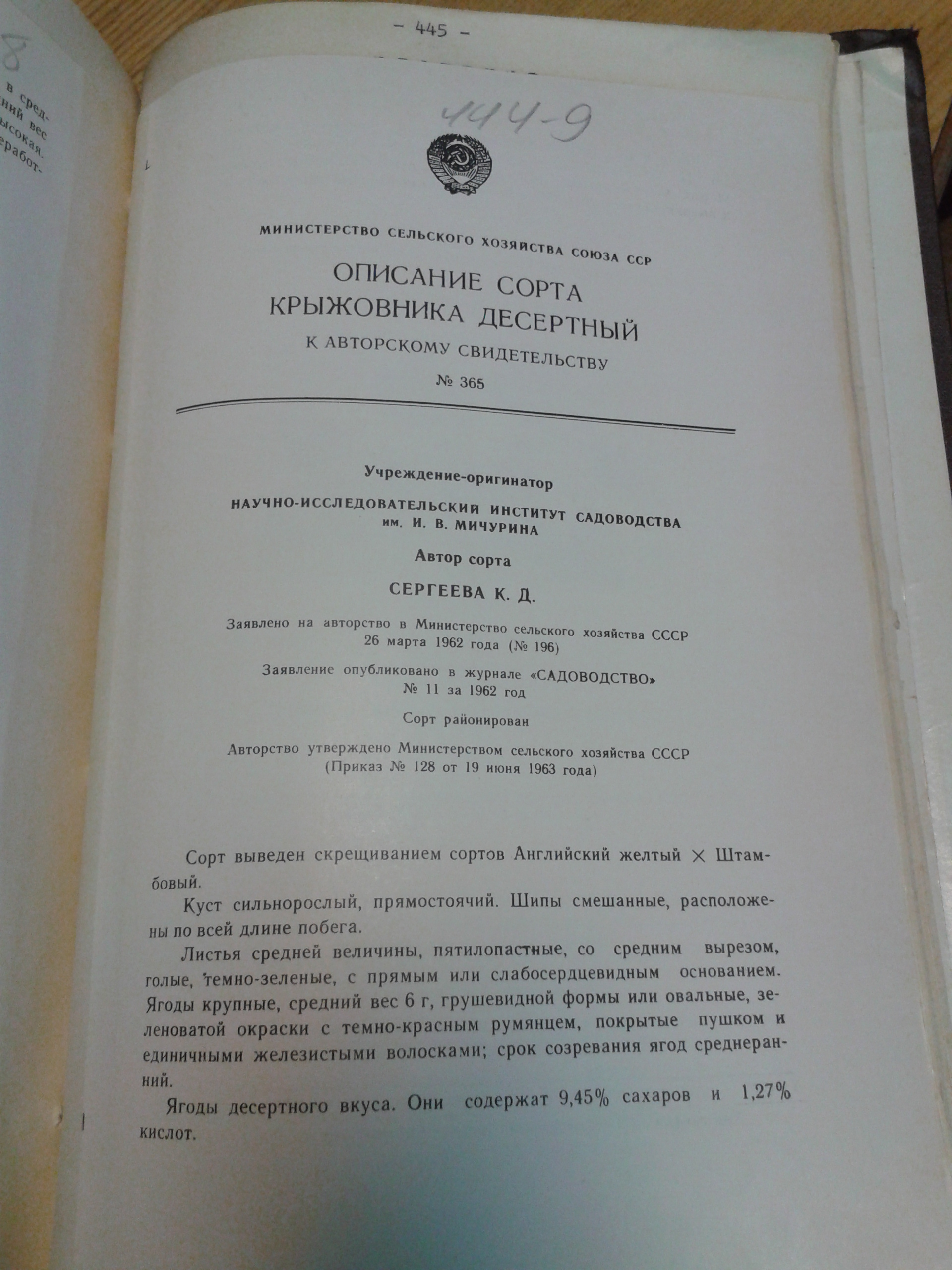 На селекционные достижения раньше Минсельхоз выдавал авторские свидетельства и такое свидетельство на сорт Десертный за авторством Сергеевой К.Д. есть - см. ниже. И Ильин это наверняка знает, потому как ему это знать положено как научному работнику, занимающемуся крыжовником с 1970-х годов.