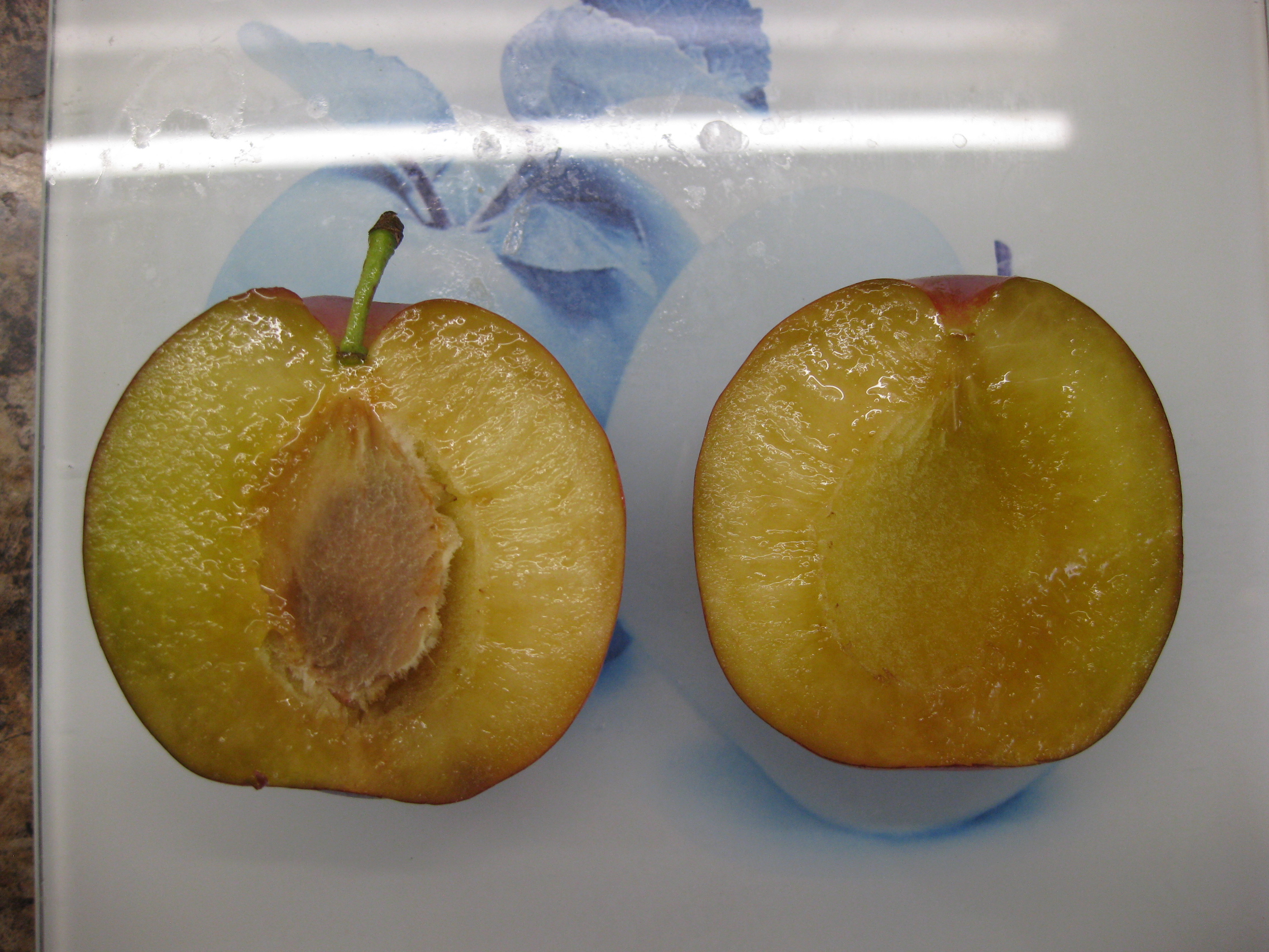 . Созревает не одновременно начиная с начала сентября , часть висит до сих пор. Средний вес плода 30-35 г. Мякоть желтая , у шкурки красноватая , сочная. Косточка отделяется плохо. Без обработок сильно поражается плодовой гнилью.