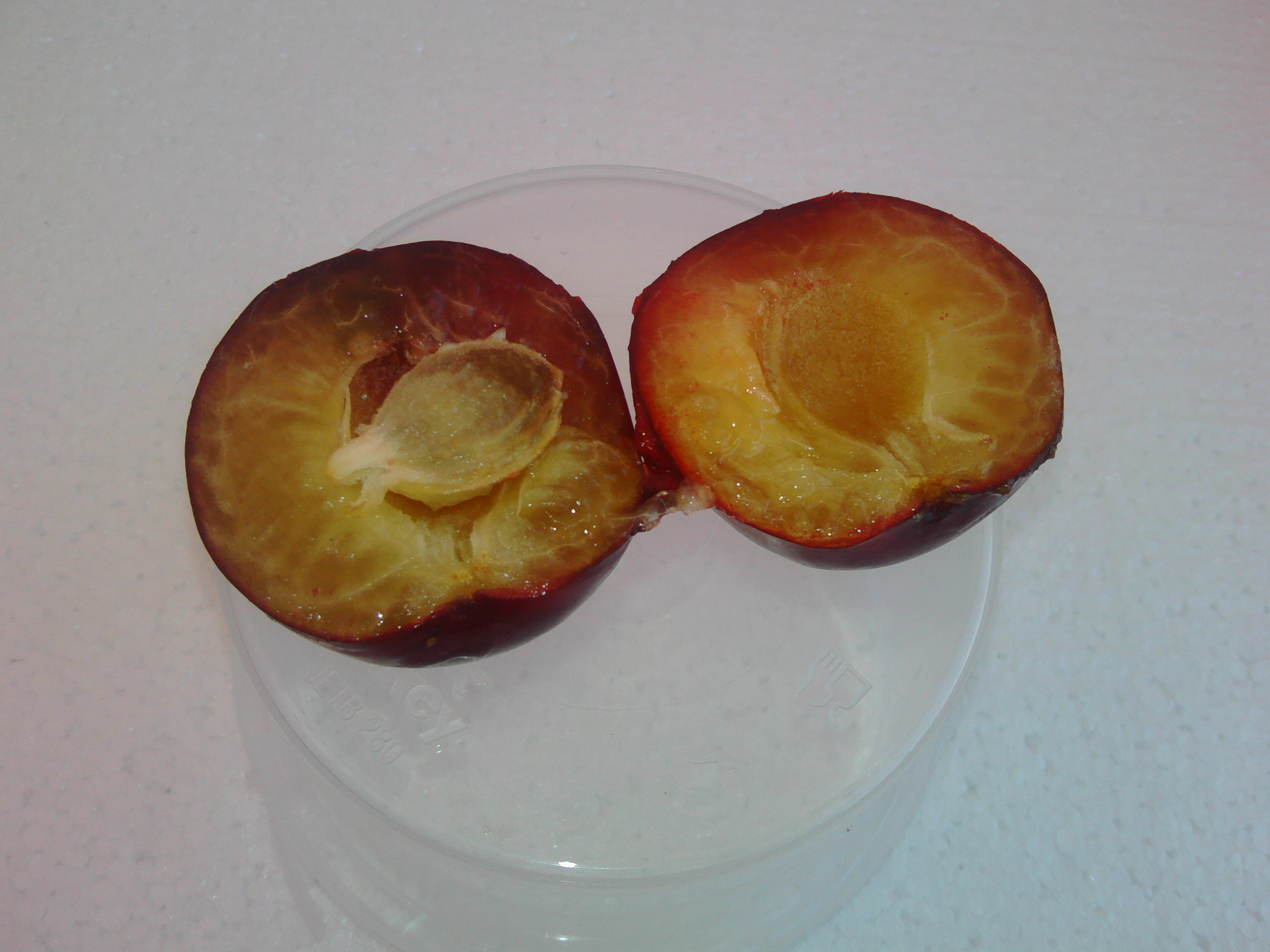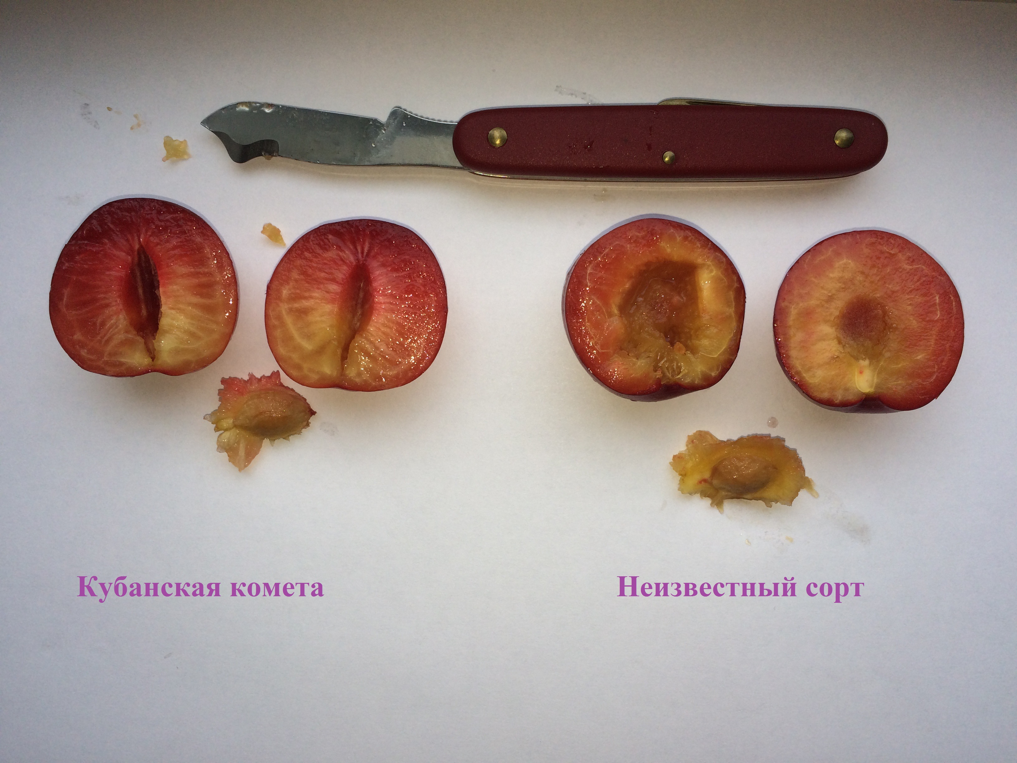 Нет, неизвестный сорт фиолетовым не видал. Терзаемый сомнением, пошел в сад и снял зрелую КК и несколько искомого сорта. Крутил-вертел, визуально практически один в один - ну не вижу разницы. Разрезал ножом - внутри тоже похожи, как с одного дерева... Или нет? Косточки тоже вроде похожи и отделяются похоже, не сложно.