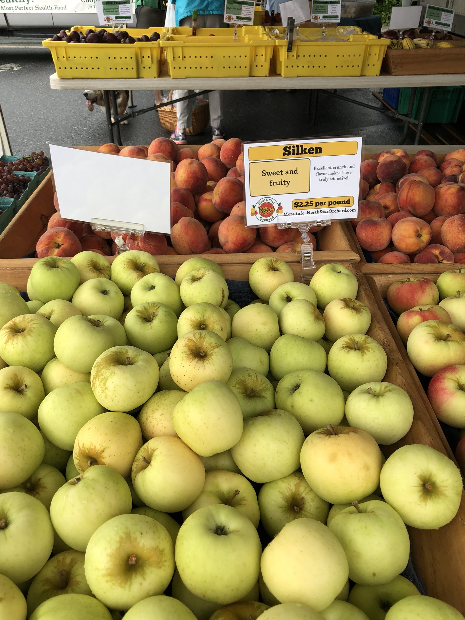 Описание плодов Силкен в Саммерленде созревает на 5 дней позже сортов Макинтош и Роял Гала. Плоды среднего размера: в 1996 г. средний вес 172 ± 4,2 г., в 1997 г. 204 ± 113 г. (вероятно опечатка, д.б ± 11,3 г. – Прим. моё). Для оценки среднего веса учитывался урожай с 5 деревьев. Поверхностная окраска от кремово - цвета слоновьей кости до бледно зеленой (8С по шкале Королевского сельскохозяйственного общества, 1986), яркая, блестящая. Иногда присутствует легкий розовый румянец (46А), но никогда в виде полос. Оржавленность воронки присутствует. Присутствуют подкожные точки зеленого цвета на недозрелых плодах, на спелых подкожные точки незаметны. Цвет мякоти белый.