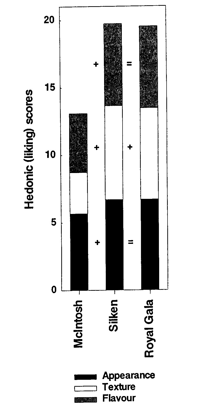Как видно из рисунка, Силкен получил такую же высокую оценку как Гала по внешнему виду и текстуре мякоти, но превзошел ее по вкусу. Макинтош был добавлен для сравнения в 1996-1997 гг. Силкен превзошел его в оценке внешнего вида, текстуры мякоти и вкуса. Силкен также превзошел сорт Санрайз по оценке текстуры и внешнего вида в сравнительных дегустациях 1995 г. (данные не приводятся).