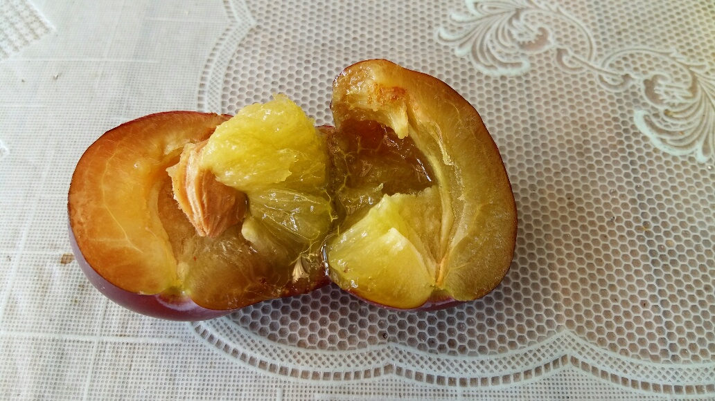 Нашел сегодня несколько перезрелых плодов.Вкус пропал совсем,одна вода.В отличие от КК которая при перезревании становится сладкой как мед!При этом кожица легко снимается,очень сочная!В любой степени зрелости КК хороша.Пока это самый вкусный сорт алычи,который мне приходилось пробовать.