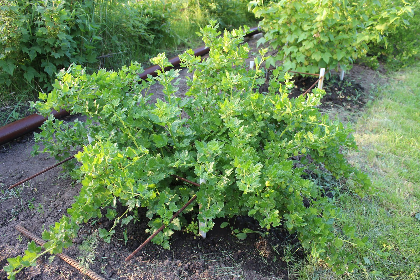 В прошлом году из-за июньско-июльского пекла урожай крыжовника был плохой. Ягода буквально сварилась на ветках. При этом Уральский розовый отреагировал особенно плохо - ветки засыхали вместе с ягодами. Я было даже подумал, что куст загибается из-за проблем с корневой. Много веток обрезал, стараясь снять лишнюю нагрузку. Тем не менее в августе куст стоял совсем без листьев. Думал - все, готовь замену. Но по весне кустик бодро проснулся и пошел в рост. На сегодняшний день имеет вид: