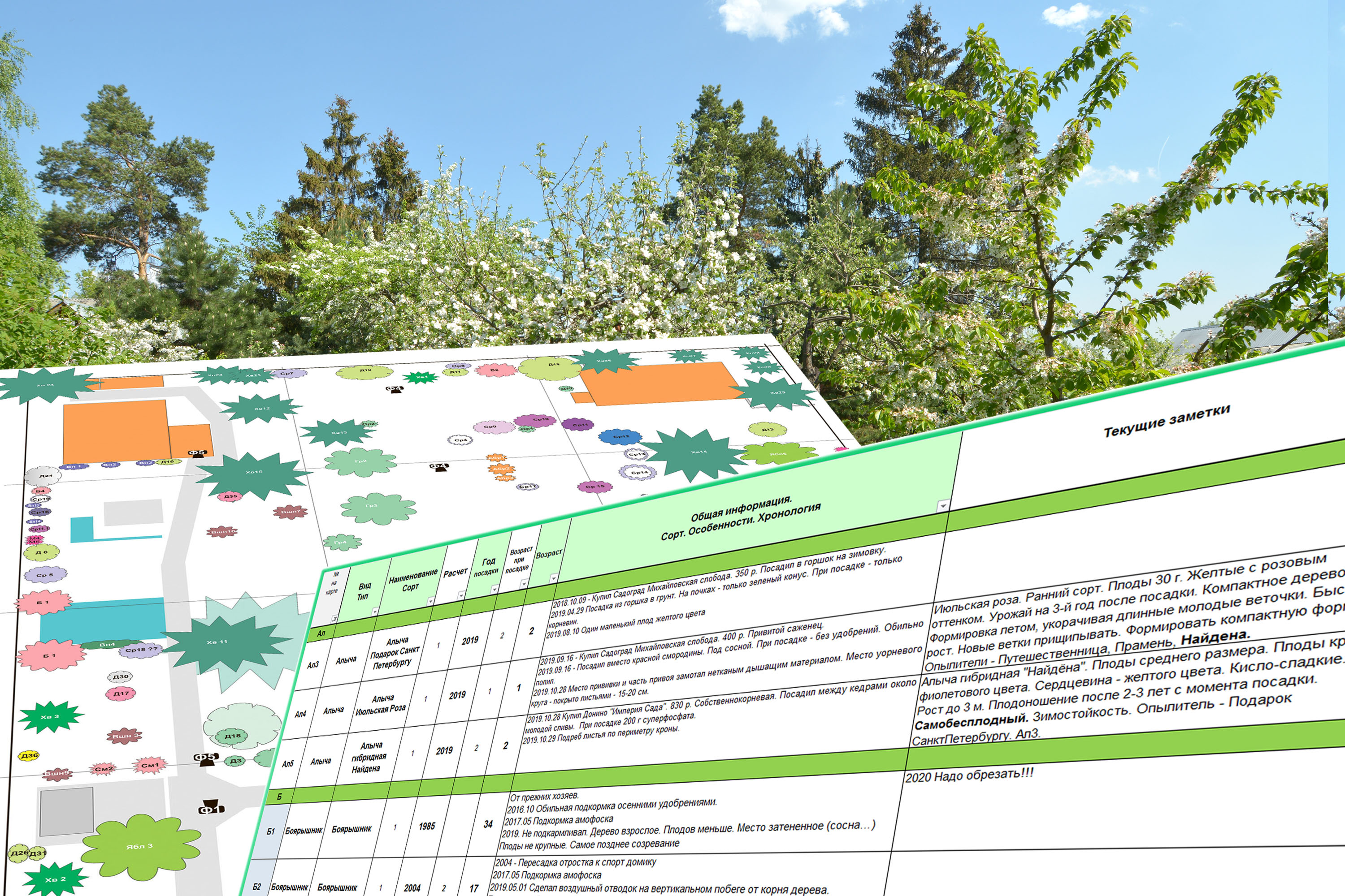 В Excel - многостраничный документ, более 30 страниц. Описание всех посадок (кусты, деревья) - информация, сортовые особенности..., описание состояния по годам, по срокам цветения и урожая по годам, подкормки и хим. обработки по годам и датам, справочные данные по сортам, сроки и информация по формировкам и обрезке по годам, схемы прививок....
