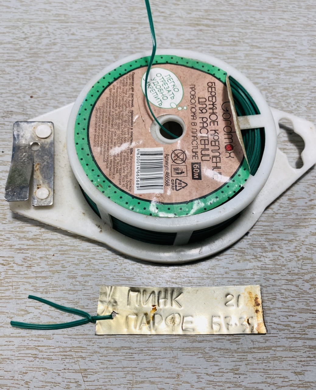 Рецепт попал к нам от Бориса (tep). Обжигаю пивные банки (без дна и верха) пока прогорают дрова в мангале. Из 1 банки получается 20-22 бирки. Прокалываю шилом. Отверстие получается почти круглым и без острых краёв. Нарезаю ножницами. Проволоку использую такую. Подписываю шариковой ручкой на мягкой подложке.