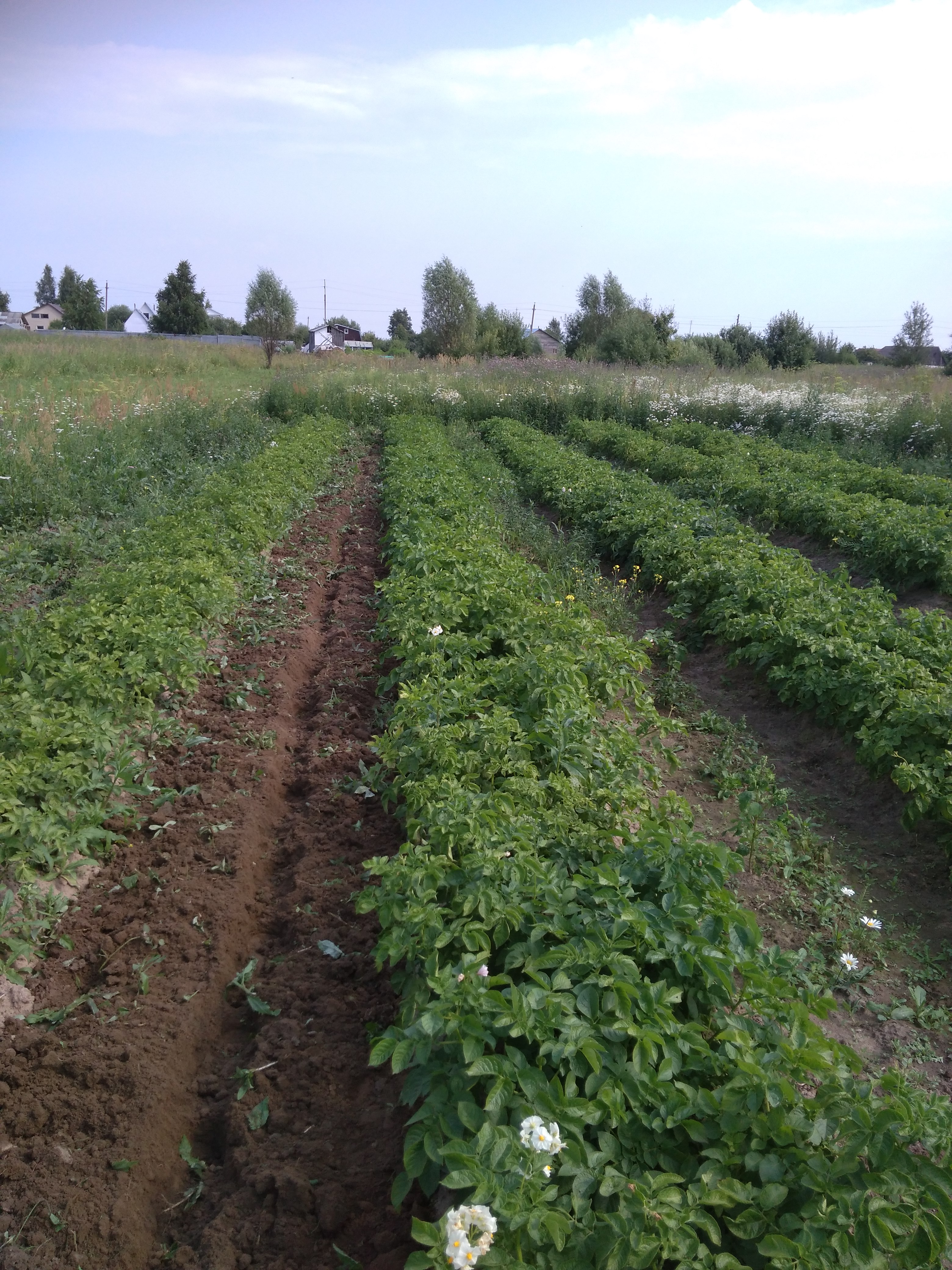 Пытаюсь разобраться в мешанине сортов которые идут у меня под названием деревенский, там оказывается как минимум 4 сорта, судя по цвету цветов и сроку цветения. Вот, картошка с белыми цветами зацвела самая первая из всех сортов.