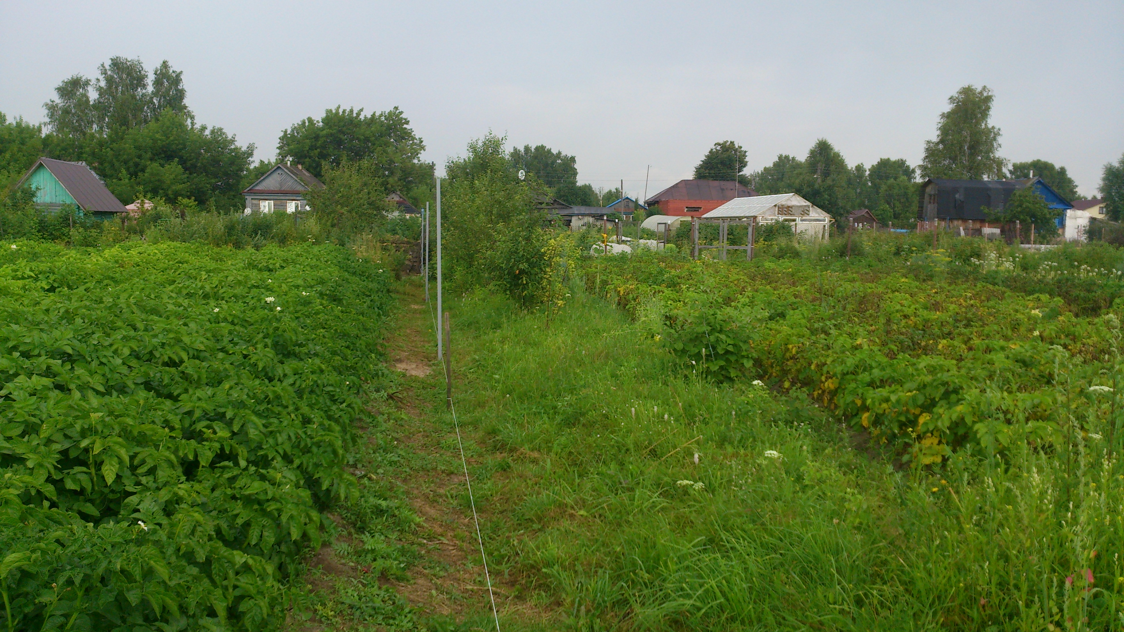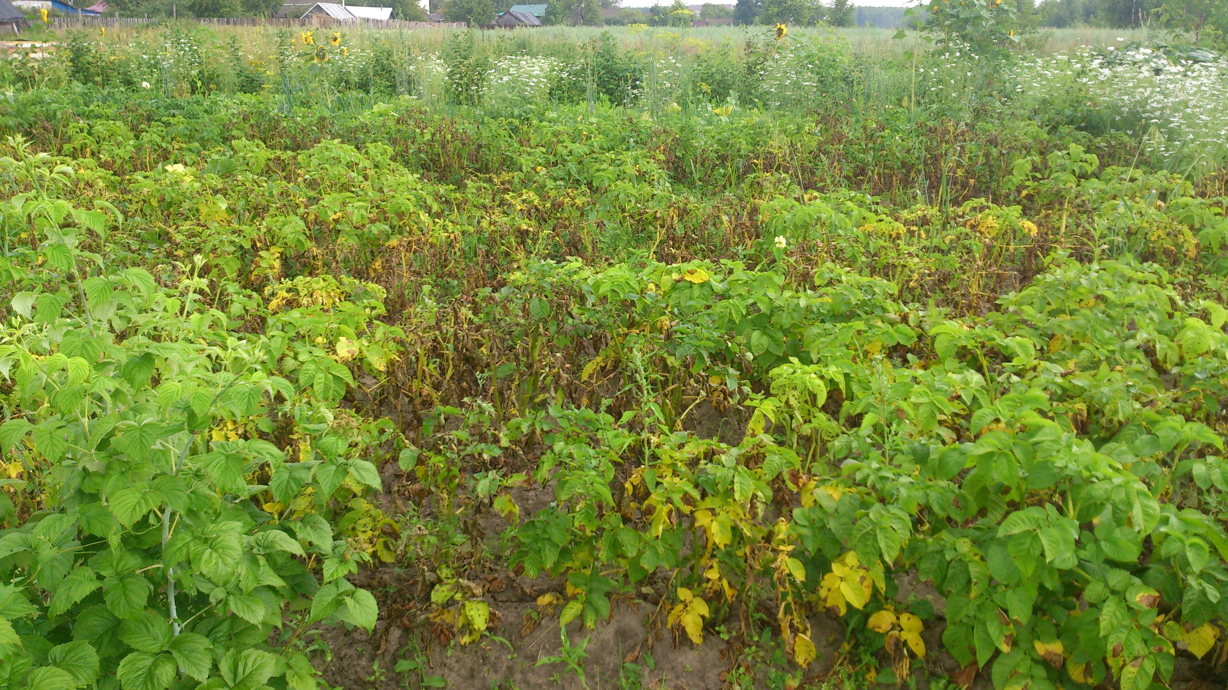 У тестя картошка совсем хиленькая, у него и так болото, а дождями совсем залило. Фитофтора и альтернариоз присутствуют. Он старенький, тяжеловато уже картошкой заниматься. У меня между рядами 70 см, а пройти уже недели две невозможно.