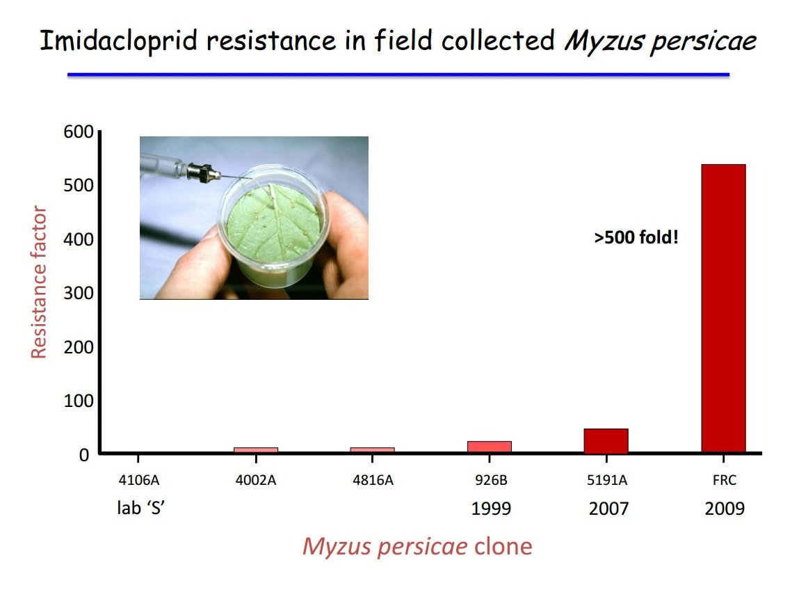 Фактор резистентности к имидаклоприду персиковой тли вырос более чем в 500 раз. С учетом того что в магазинах для ЛПХ огромное количество препаратов с разными названиями на основе имидаклоприда 200 г/л, то немудрено что к нему уже насекомые привыкли. А если где еще не привыкли, то это вопрос времени. Я с имидаклопридом тоже завязал. Из инсектицидов под рукой Калипсо, Мовенто Энерджи, Моспилан, Кораген, Децис, Клотиамет (на основе клотианидина), Фитоверм. Более чем достаточно для чередования.