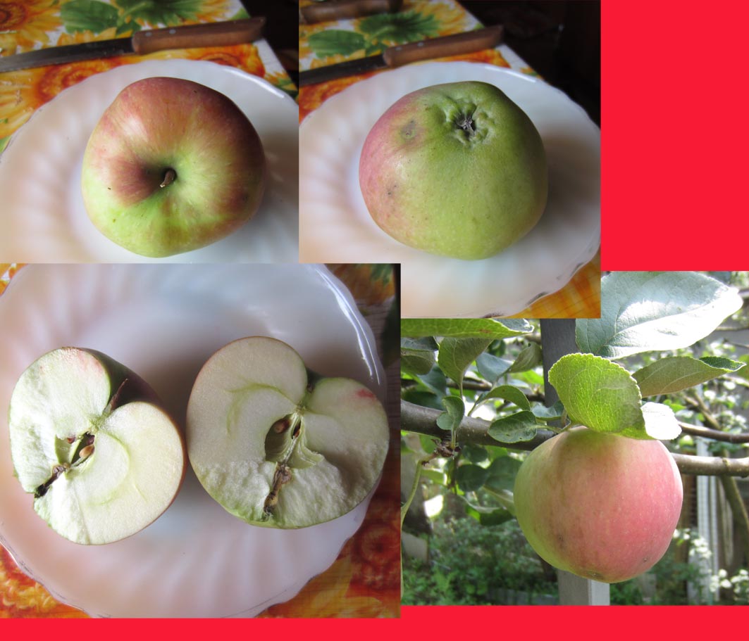 Как вариант еще можно предположить что-то из орловских иммуников, производных от г/ф 814. Верхний снимок: по листьям и плодам очень похоже на Афродиту, но на моей побеги светло-коричневого цвета. У спелых яблок должен быть сильный ягодный аромат и розовые прожилки на разрезе... Или другой осенний сорт - Солнышко, он по своей природе слаборослый. Эти яблоки более кислые и имеют тенденцию к предуборочному осыпанию при недостатки влаги в почве.