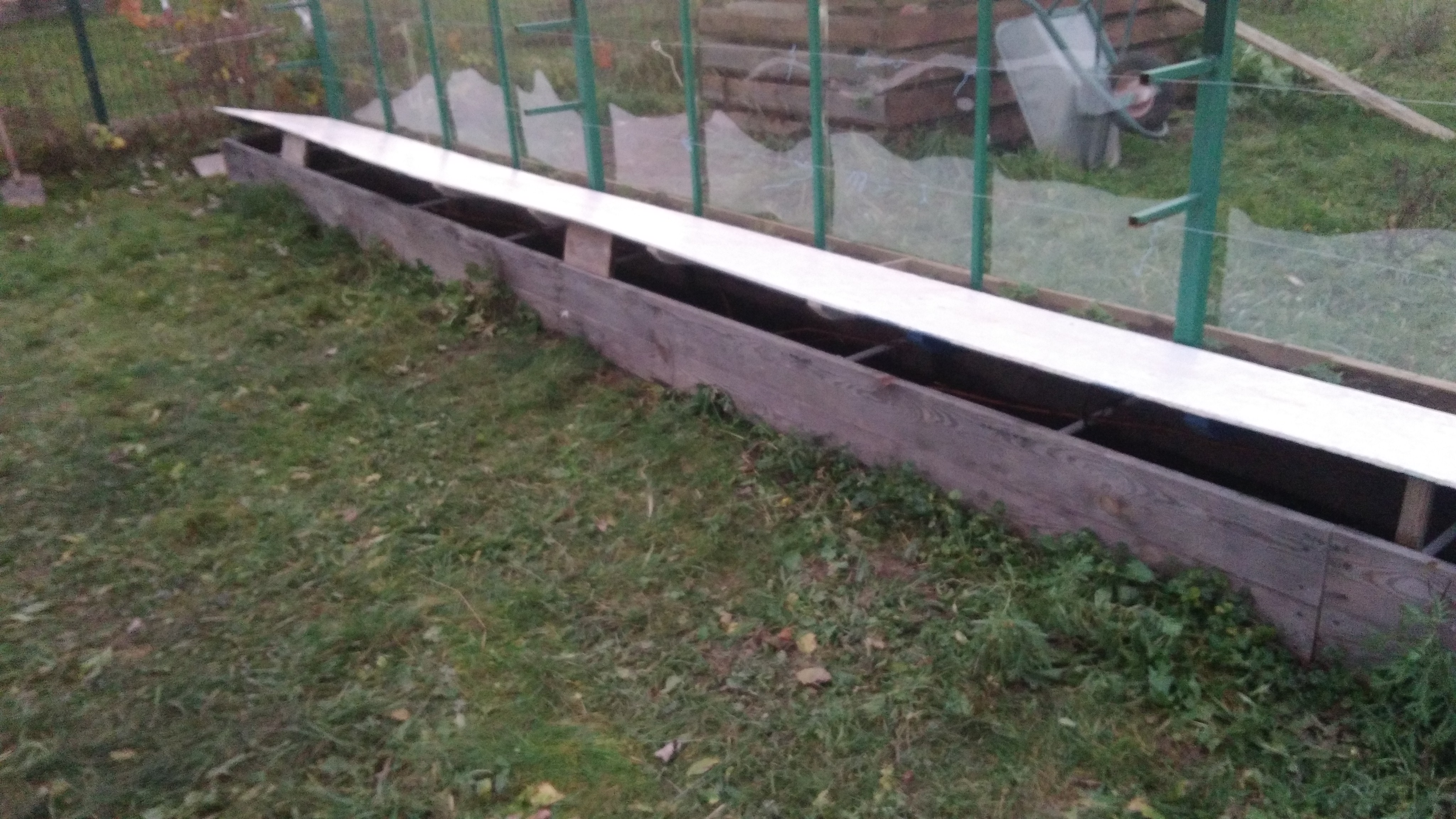 Пока верхние щиты приподняты для проветривания, на зиму закрою и сверху положу пленку что бы в щели не затекала вода.