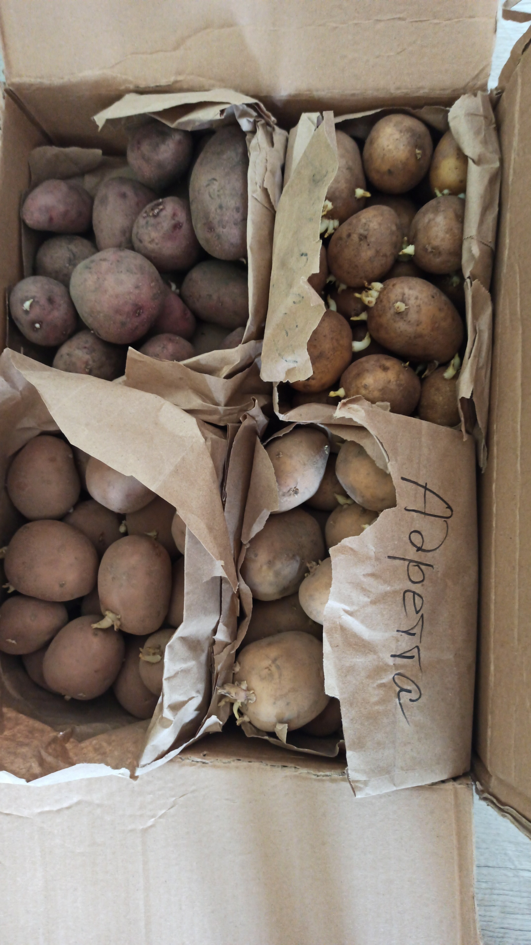 Королеву Анну вытащили ещё 1-го апреля. Прошло две недели при 20С у батареи. Она долго думала и проклюнулась на 1-2 миллиметра. Даже без лупы видно ростки. Когда первый раз купил её в цветочном, мне казалось её ретардантами обработали как едовую магазинную картоху для предотвращения прорастания. Типо, моно-N,N-диметилгидразидом янтарной кислоты /Регулар, Алар, Даминозид/. Оказалось энто особенность сорта.