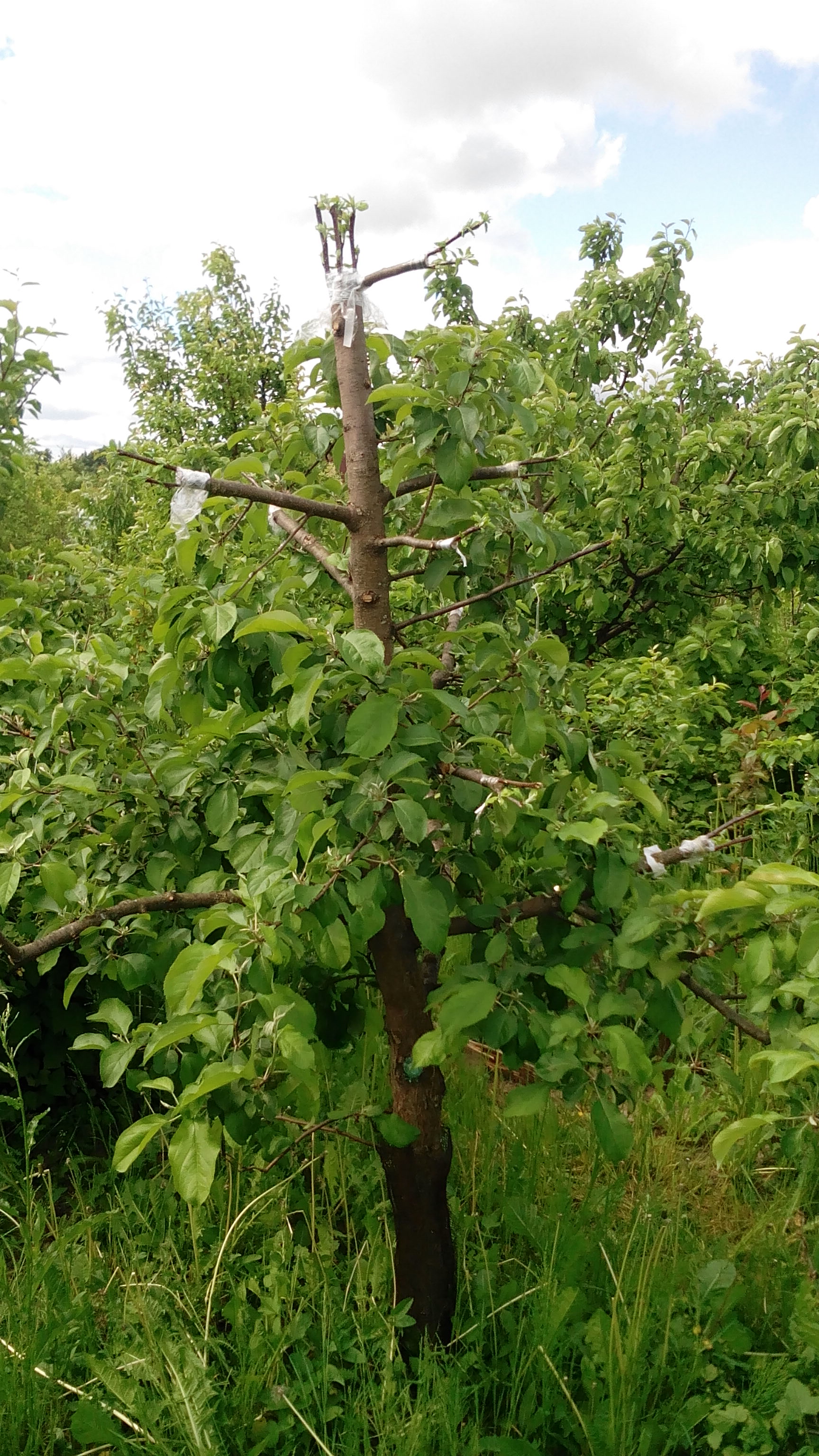 Перепрививка антоновки уже в этом году сортом Строевское. Фото сделано дней 10 назад, сейчас все радикальнее. Одну ветвь оставил для питания, потом наверное удалю.