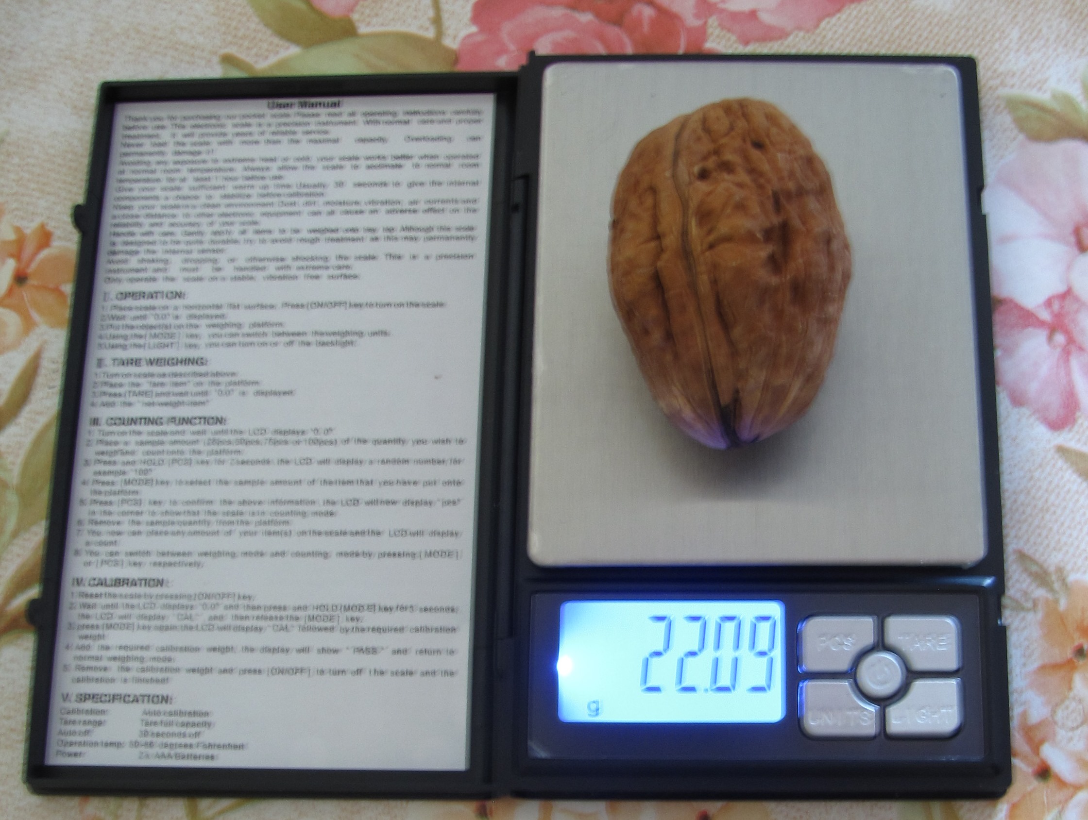 Lange van Lod: практически весь скудный урожай оказался повреждён болезнью, орех имел массу 22,1 г, выход ядра 30,8%, оба показателя были ниже, чем указывается в доступных источниках, орех раскололся легко, ядро извлеклось целиком. На фото ниже снят тот же орех, фото которого размещал в сообщении на стр. 265, можете сравнить показания весов на обоих снимках.