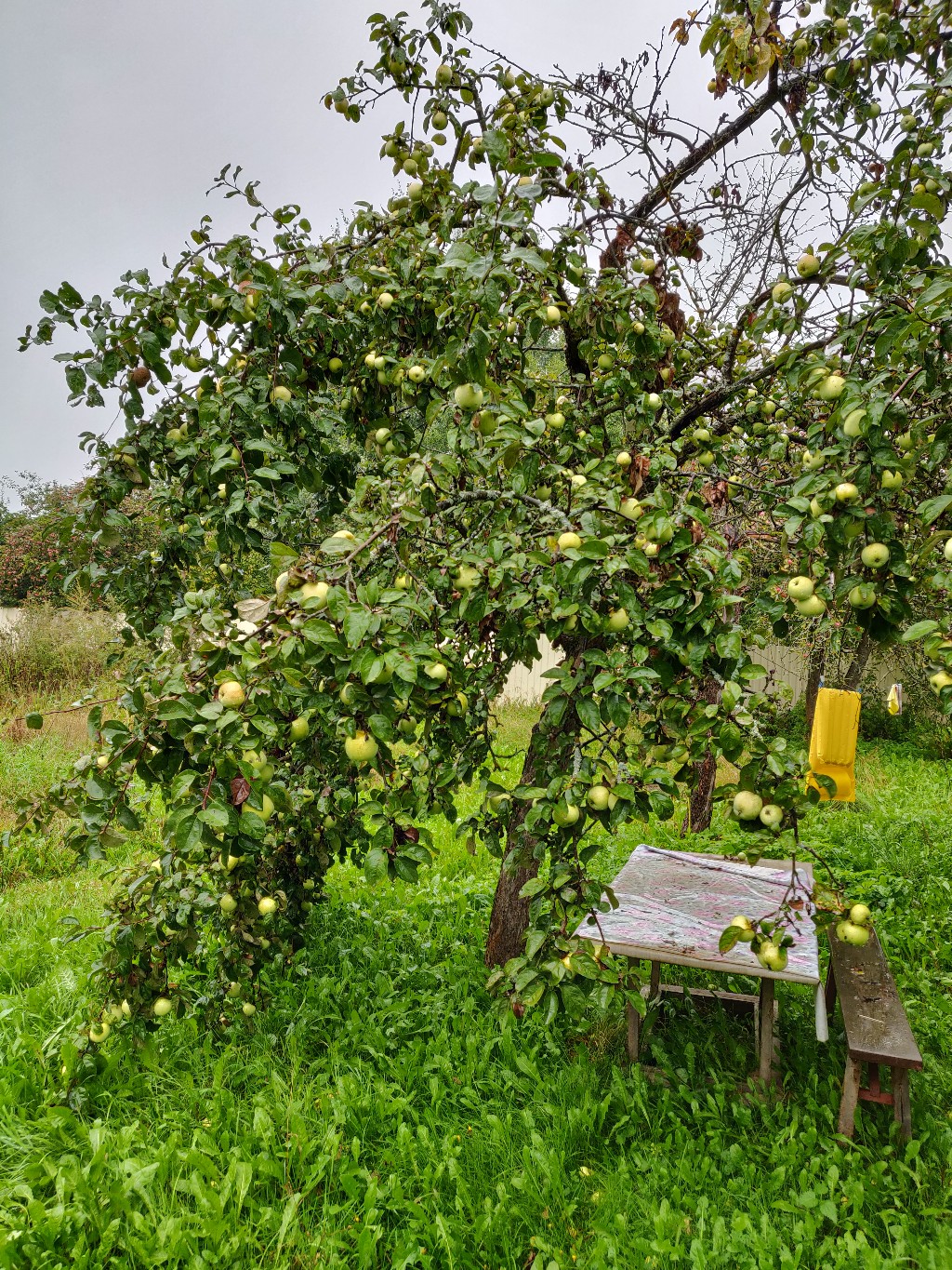 Похоже на Антоновку обыкновенную, возможно клон. Созрело явно раньше, возможно из-за жаркого лета. Ещё пару недель назад кисляк был, не укусишь. Сейчас нормальный вкус зрелой Антоновки с ветки с привкусом славянки. Начинают желтеть бочка. Какого либо сильного яблочного запаха Антоновки не чувствуется. Вот у Грушовки, да, чувствуется.