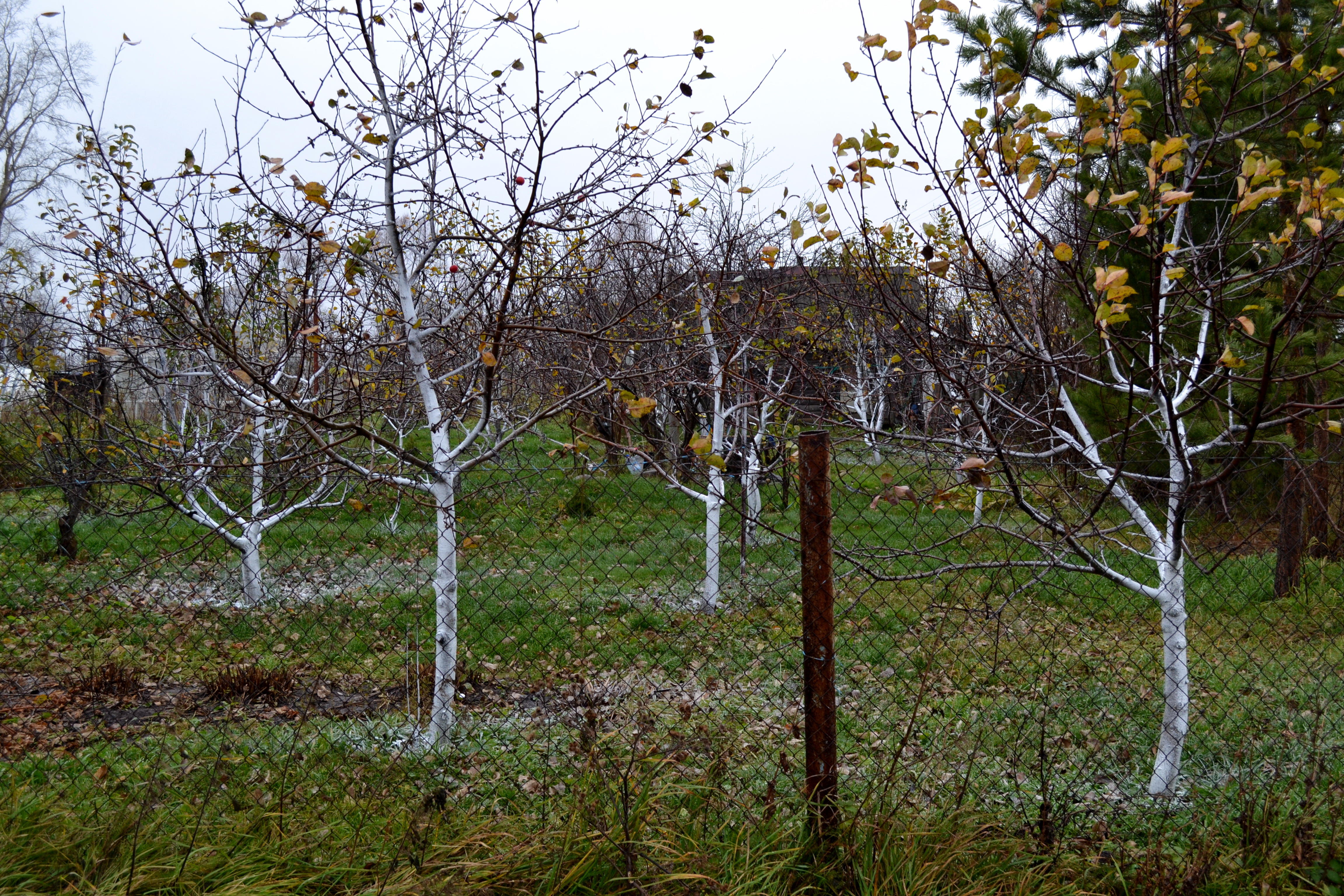 Исходя из этого несколько сезонов красил стволы и скелетные ветви смесью глины,3% медного купороса и мела,он лучше держится и после высыхания раствора придаёт белый цвет.Второй сезон перешёл на опрыскивание раствором 3% медного купороса и кальцинированной содой,держится лучше,до весны частично сохраняется.Получается два в одном,и искореняющая,и побелка.