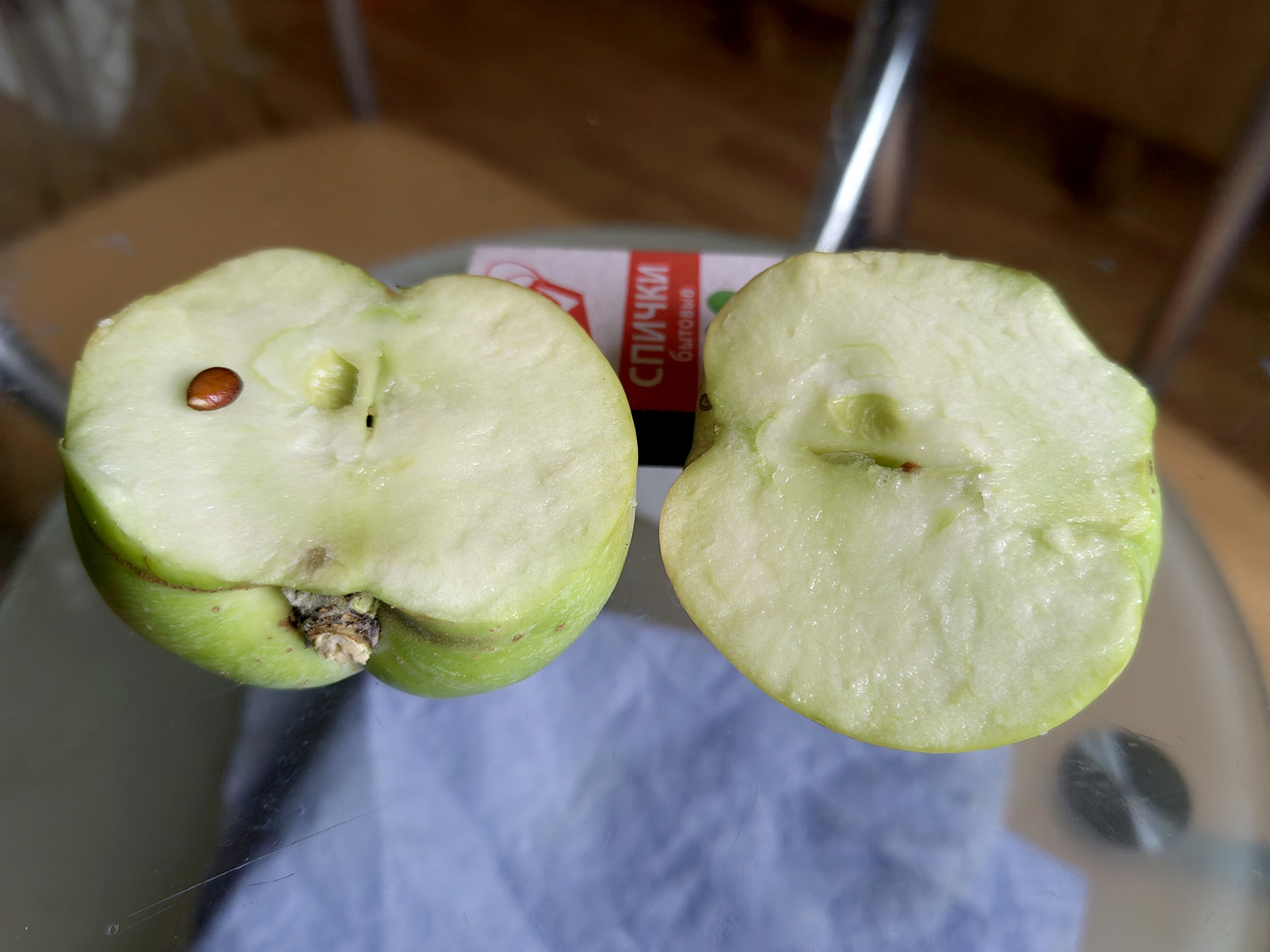 Помню, этот маленький, дохленький саженец подарили бонусом к покупке под названием Пепин Шафранный. Рос долго, не торопясь.Сейчас 2м, первые сигналки.Вчера убрал, не дозрели, кислота,дубовые.Все пять плодов на ветках прилипли,как облепиха.Что за сорт?