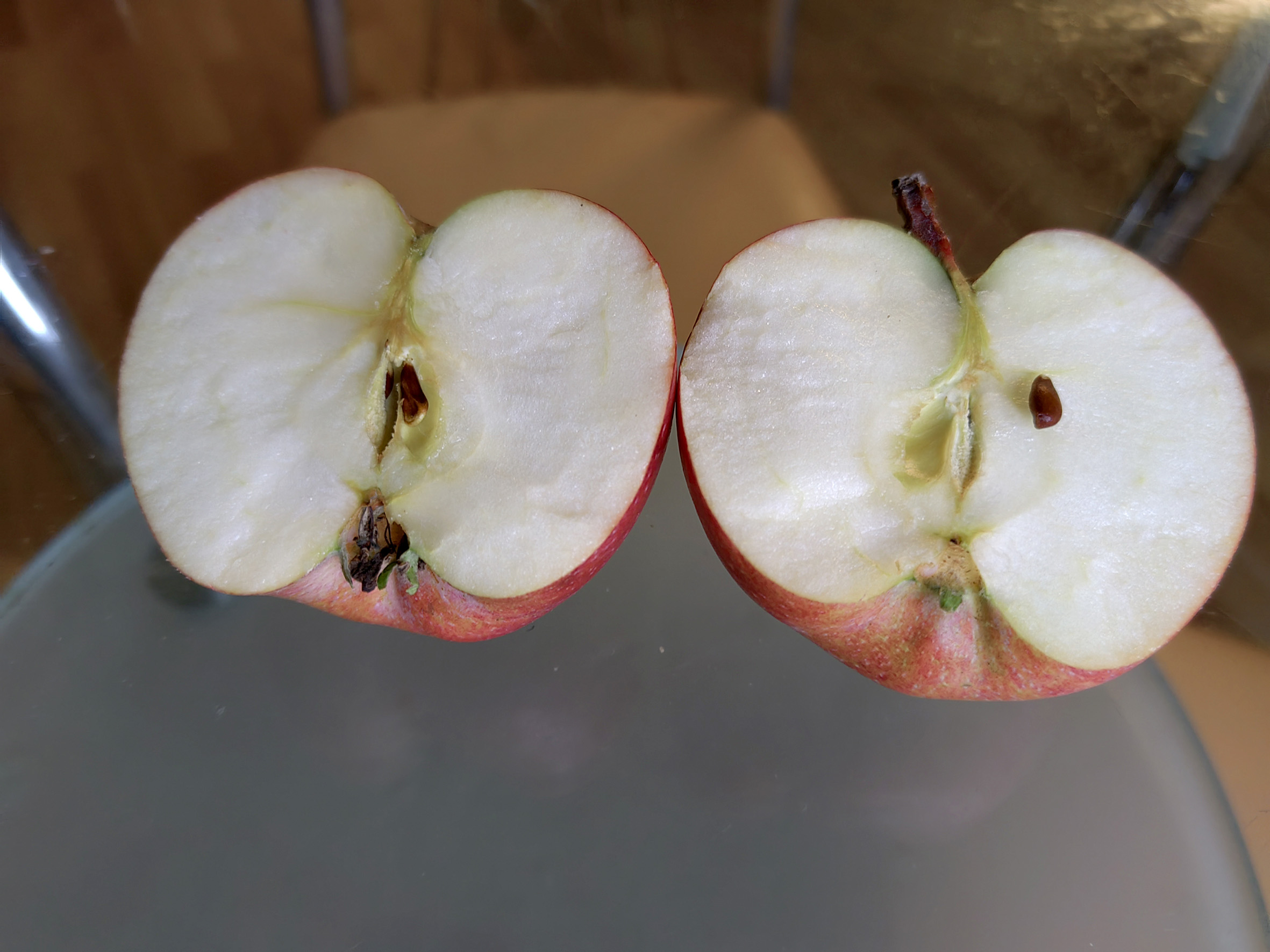 Вот мой лобо, в описании лобо ,,плодоножка не выходит за пределы воронки,, хотя многие фото в инете не подтверждают это.Уже сейчас замечательный вкус, сохраняет твердость и отличный вкус до января в обычном погребе.В этом году порезвился цветоед, яблок мало.На фото мякоть белая, на самом деле имеет зеленоватый оттенок.