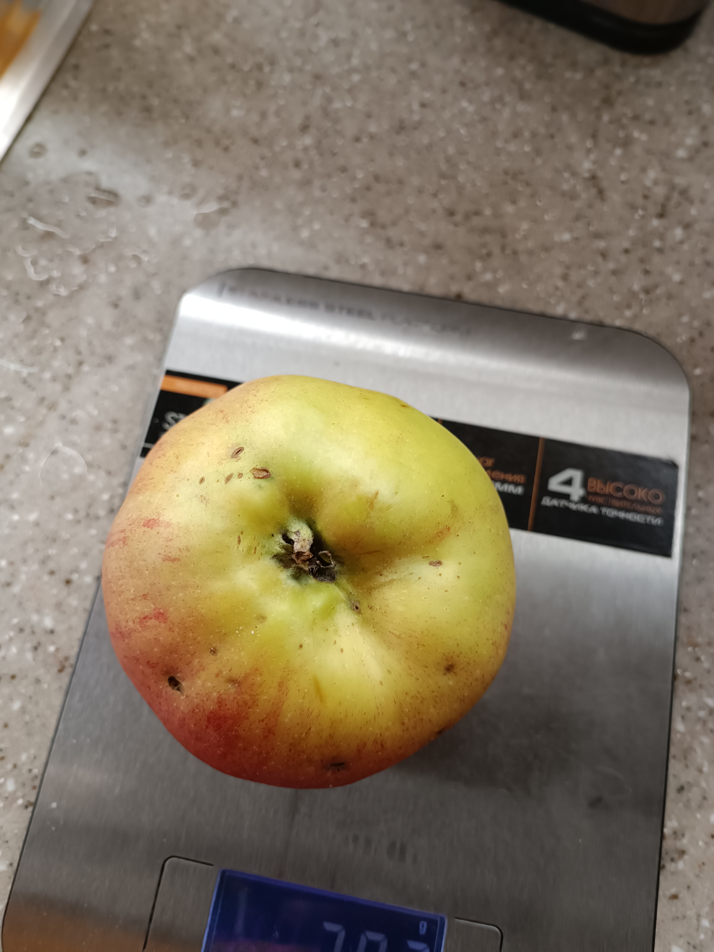 Яблоки желтого цвета, большие, очень сочные, сладко-кислые. Осенние. Когда снимали осенью цвет был до золотого и некоторые яблоки с прозрачностью. Дерево было обычное, но рядом растущий Штрифель был выше. Соседка на название Куйбышевское сказала, точно не оно. Вспомнить не может, но не русское, что-то типа штрифель. Плодоносило через год.