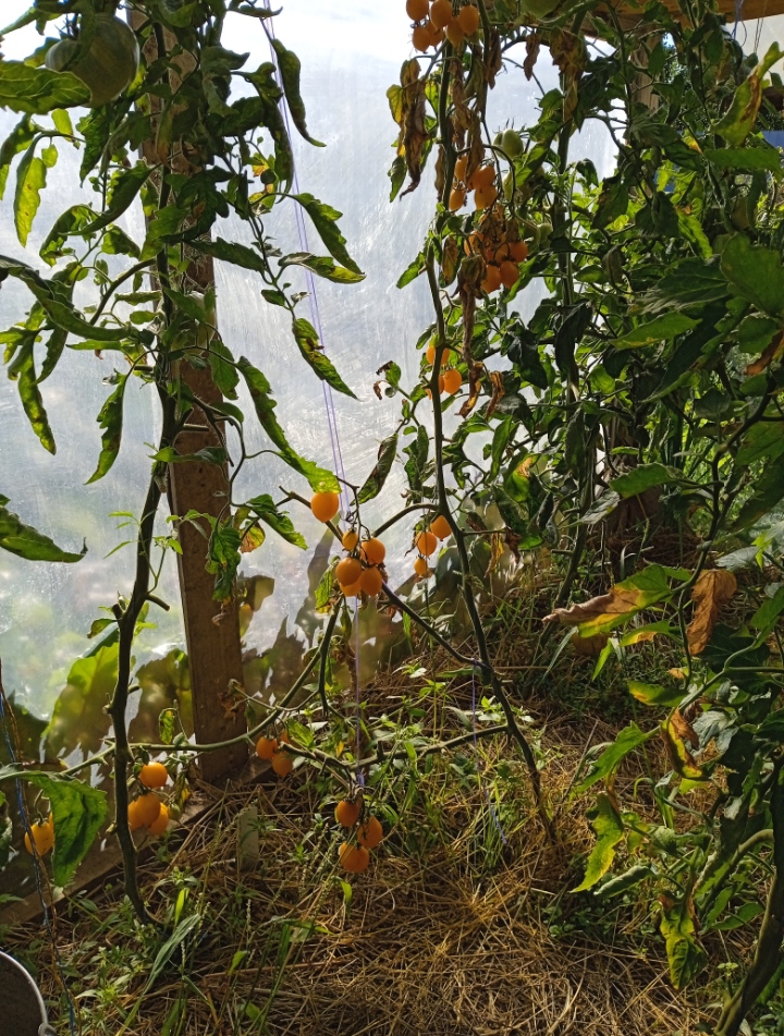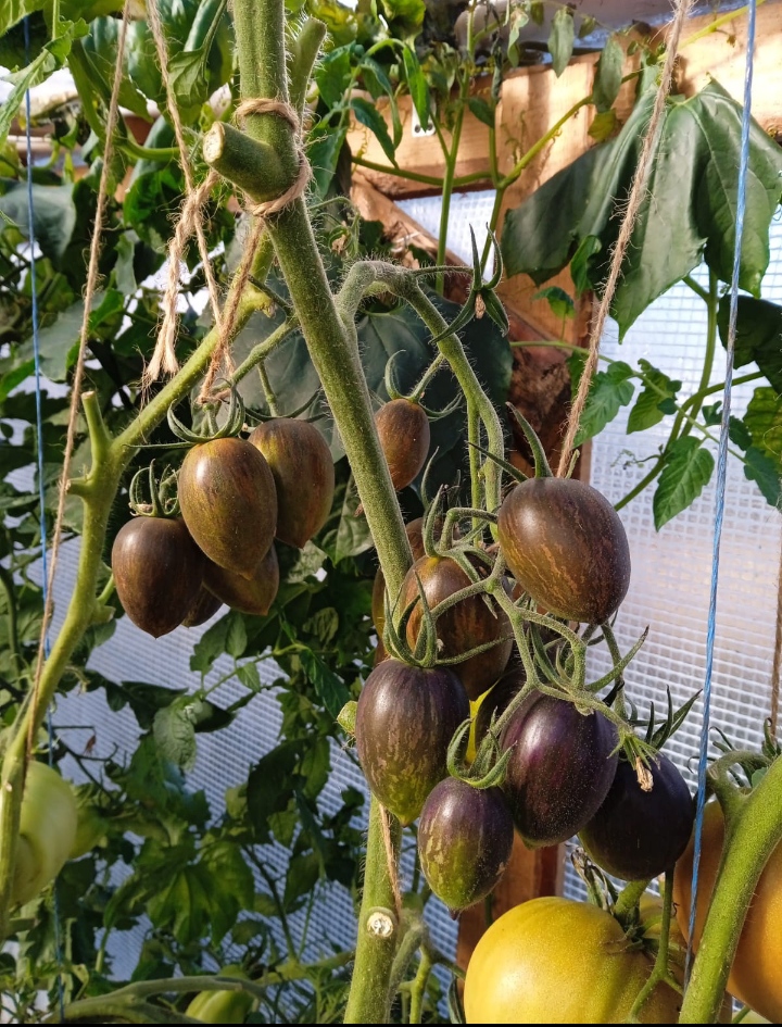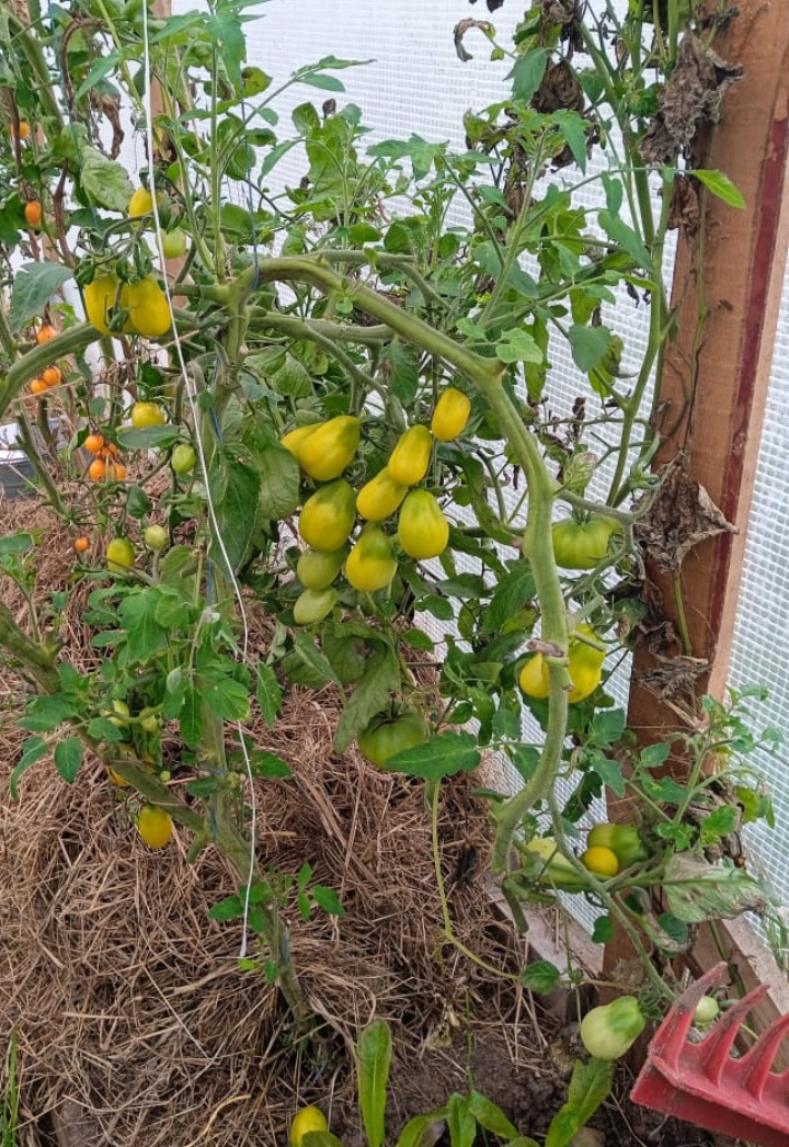 В прошлые выходные снял последние томаты. Ими оказались Чиливерде от Гусева, в холодных условиях вытянувшееся в лампочку очень нежные с чуть заметной кислинкой. Я бы сказал что больше перезревший га кусту томат напоминает перезревшее киви и последние черри Краски.
