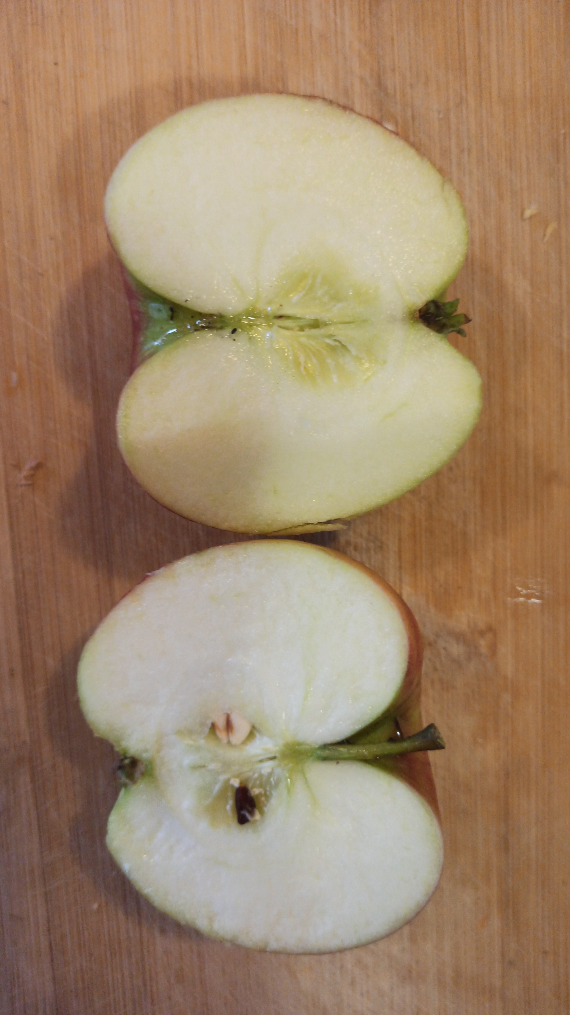 Разница с описанием в отсутствии розовых прожилок в мякоти, сфоткала на разрезе. Правда это яблоко недоспелое, совсем спелых пока больше нет, но и на спелых не заметила...присмотрюсь внимательнее к этой характеристике.