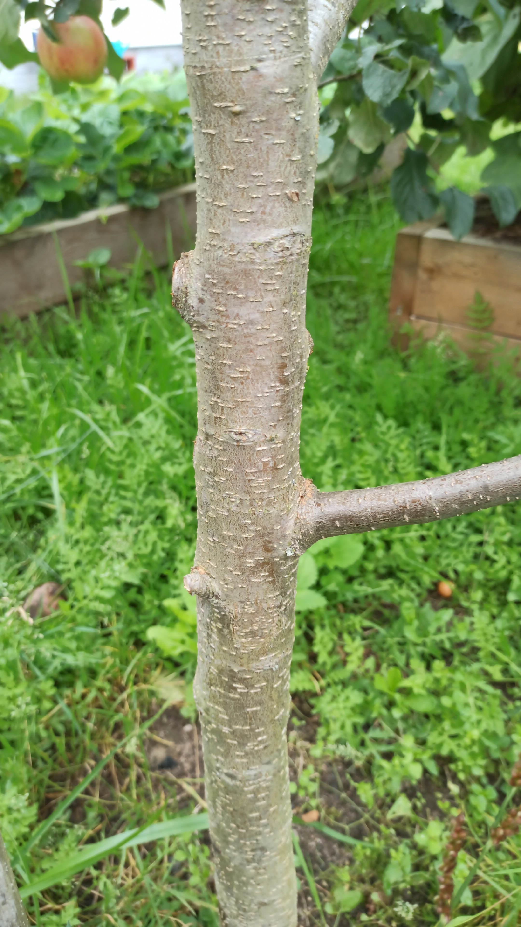 И цвет коры. В описании сорта Мечта кора обозначена как красно-серая, а у меня просто серая, сфоткала. И молодые побеги обозначены буро-зеленые, у меня шоколадно-коричневые.