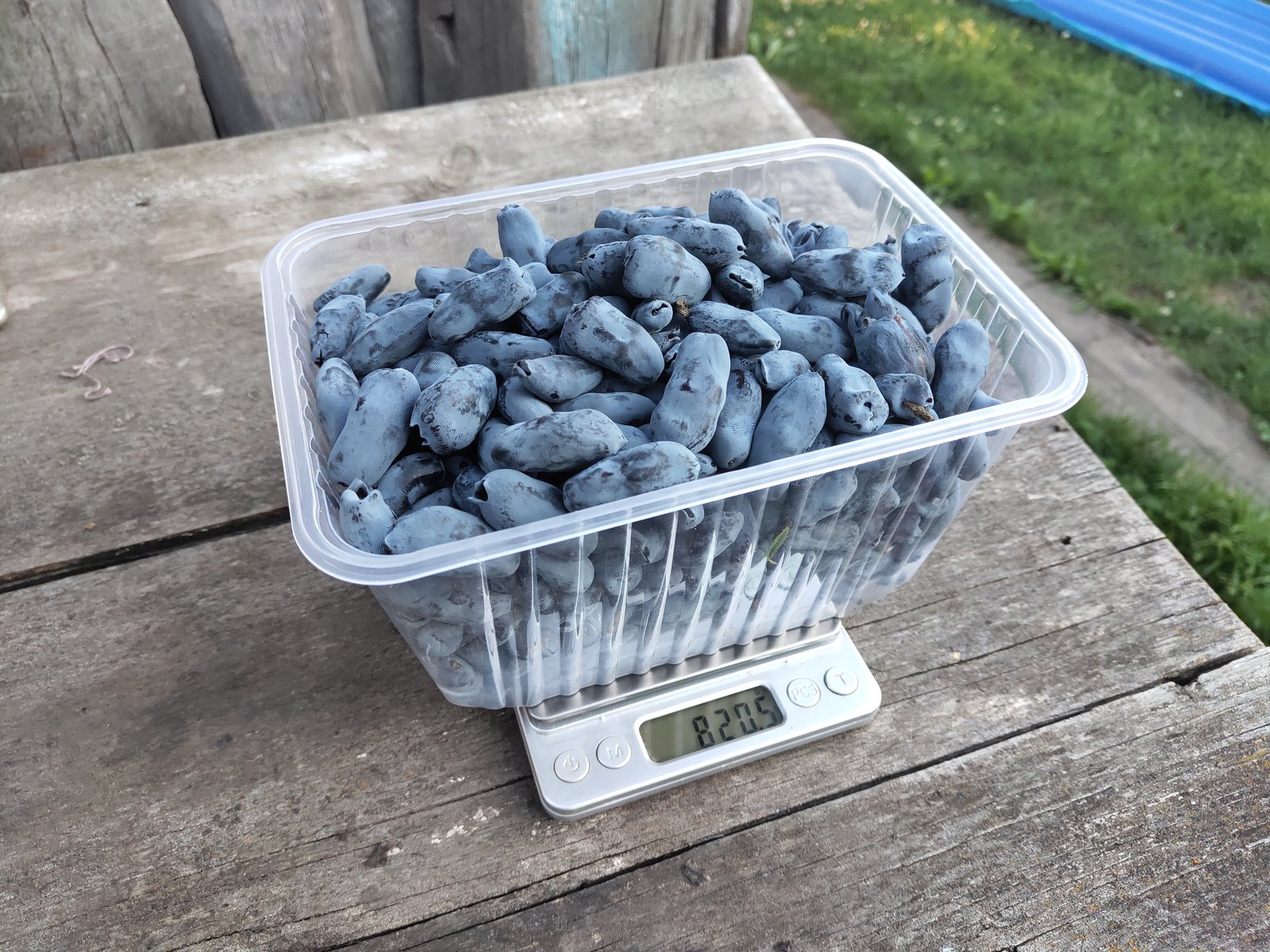 Последний кстати еще очень прочно висит, в связи с чем сбор урожая отложил до выходных. Ягода очень одномерная, сорвал первую попавшуюся. Думаю, средний вес ягоды будет в районе 2 г. Ну а общую урожайность узнаем уже скоро. А пока констатирую, что сезон жимолости у меня получается очень растянутым. Все сорта, кроме Бореал Бьюти хорошо висят, не осыпаются. Можно собирать урожай по мере необходимости, без надрыва.