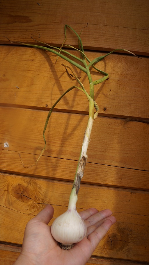 Сорт - ОБД (одна бабка дала) А это до обрезания стебля, что бы было видно, что это именно однозубка чеснока, а не, например, луковица. Но в чем смысл выращивания таких однозубок? С них получаются чесночинины с большим количеством мелких зубков. Проверено. Я для получения товарных луковиц высаживаю только средние однозубки. А крупные идут исключительно в маринад.