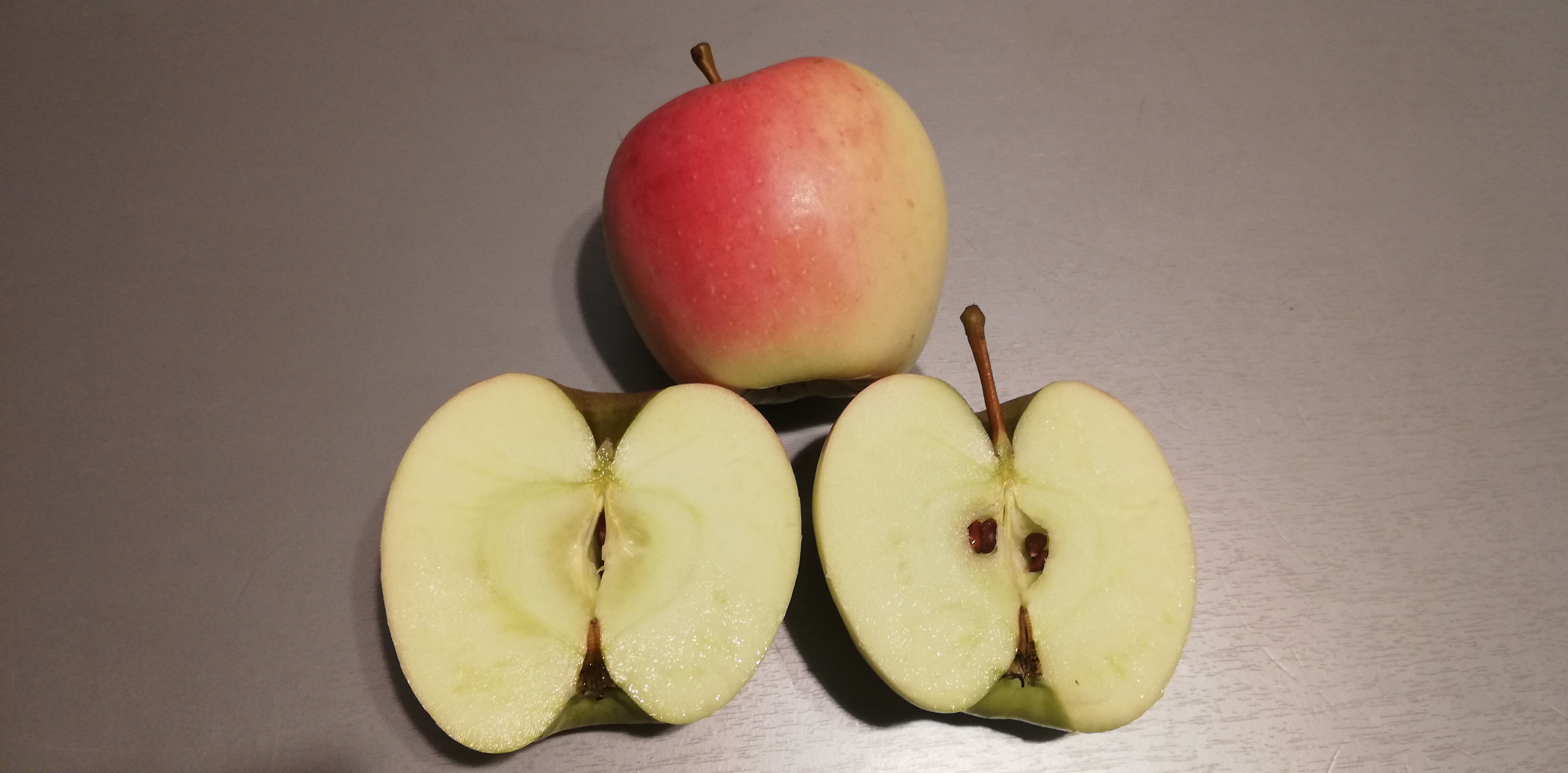 У большинства яблок этого сорта покровный окрас обычно занимает примерно 3/4 площади поверхности. Мякоть плотная, мелкозернистая, белая с небольшими розовыми прожилками, которые расположены ближе к поверхности. Очень сочная, на воздухе быстро темнеет. Семена типичного коричневого цвета, остроконечные. Из-за небольшой терпкости, которая появилась у яблок в этом сезоне, вкус чем-то напоминает Вильямс Прайд. Но гораздо более ароматные.
